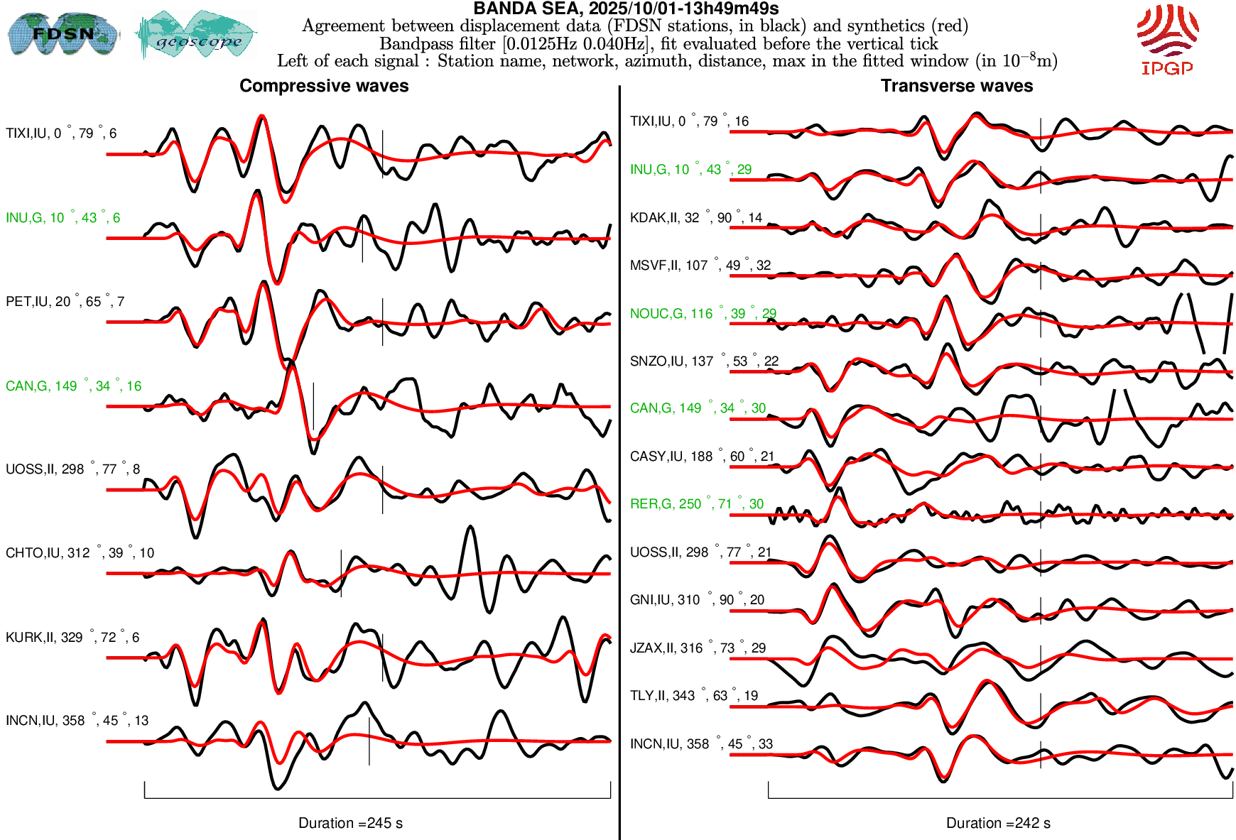 The SCARDEC solution is used here to predict the waveforms at all Geoscope stations received in real time and located at distances between 30° and 150° from the earthquake. All available location codes are used, for the BH* channels. In the range [30° - ~90°], the prediction is done on P and S(H) waves and in the range [~90° - 150°], it is done on PP and SS(H) waves. See agreement for P or PP waves (vertical components) between data and synthetics in Figure 1; see agreement for S(H) or SS(H) waves (horizontal components) between data (black) and synthetics (red) in Figure 2. Tables 1 and 2 provide quantitative estimates of these agreements.