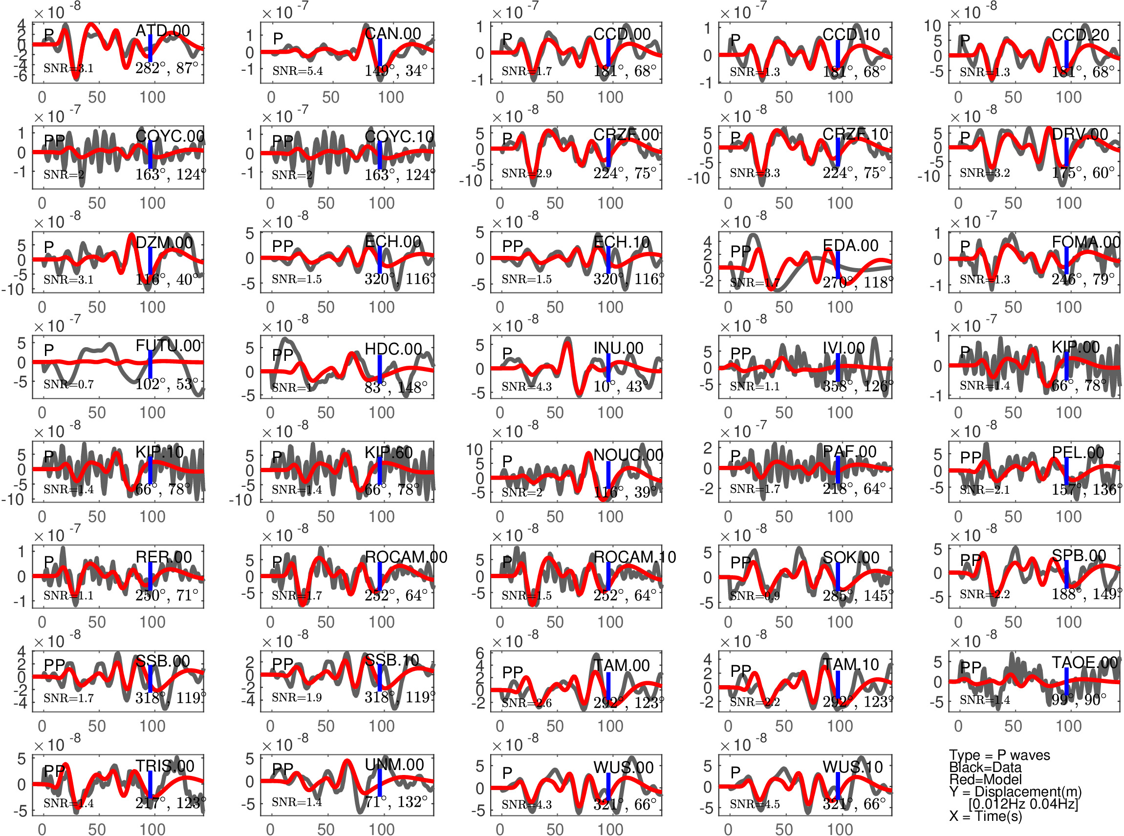 Figure 1: Agreement between data (black) and synthetics (red) for P or PP waves (the type of waves used is indicated in each subfigure). The comparison is shown with a time shift (noted 'Dt1' in Table 1), corresponding to the optimal fit ('Fit1' in Table 1) before the blue tick. Also indicated are the azimuth and distance of the station, and the signal to noise ratio (SNR). Note that the prediction done for PP waves is expected to be less accurate than the one for P waves.