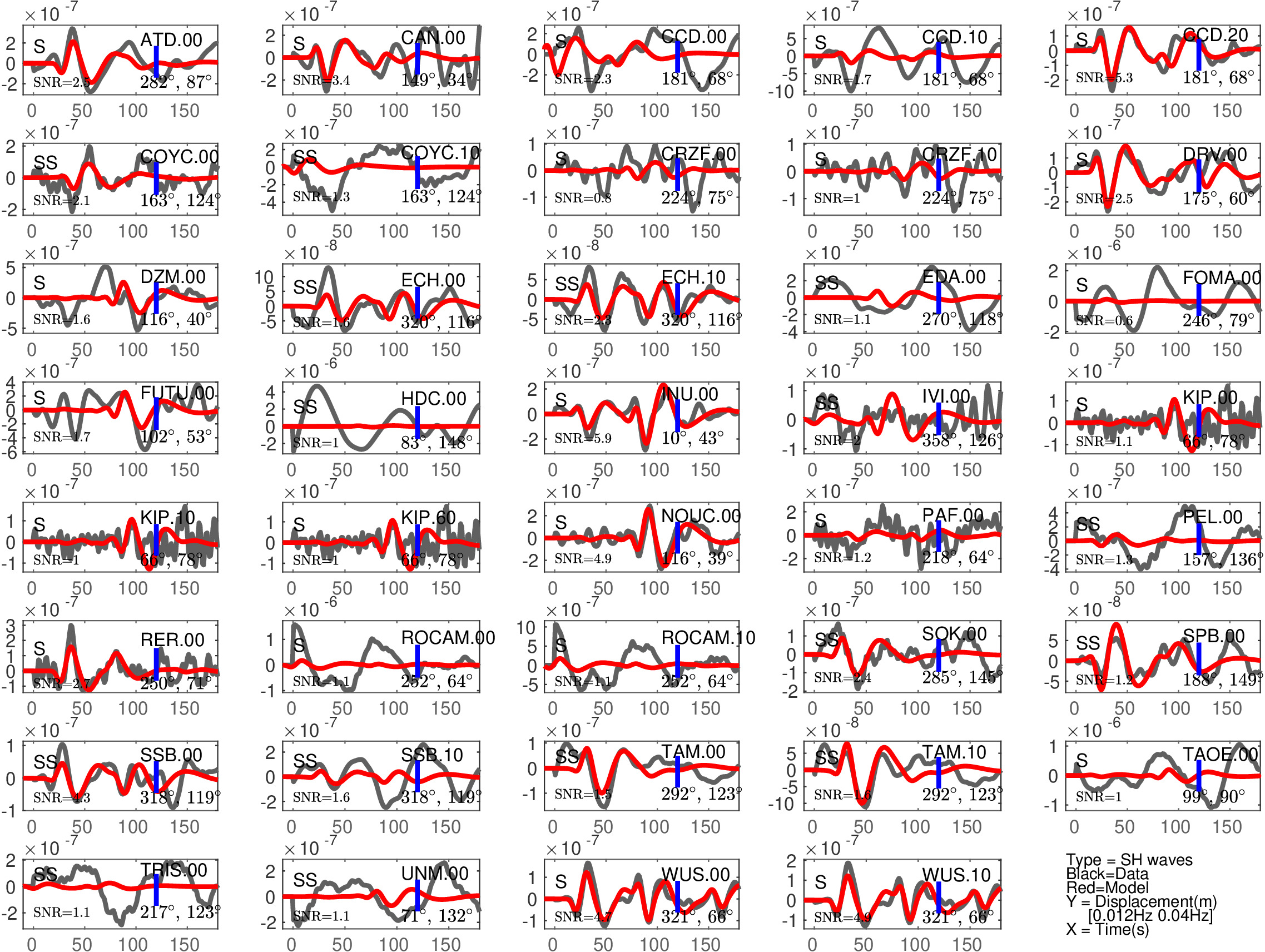 Figure 2: Same as Figure 1, but for S(H) or SS(H) waves (use of the rotated horizontal component along the transverse direction). See in Table 2 the quantitative estimates ('Dt1' and 'Fit1') corresponding to this Figure.