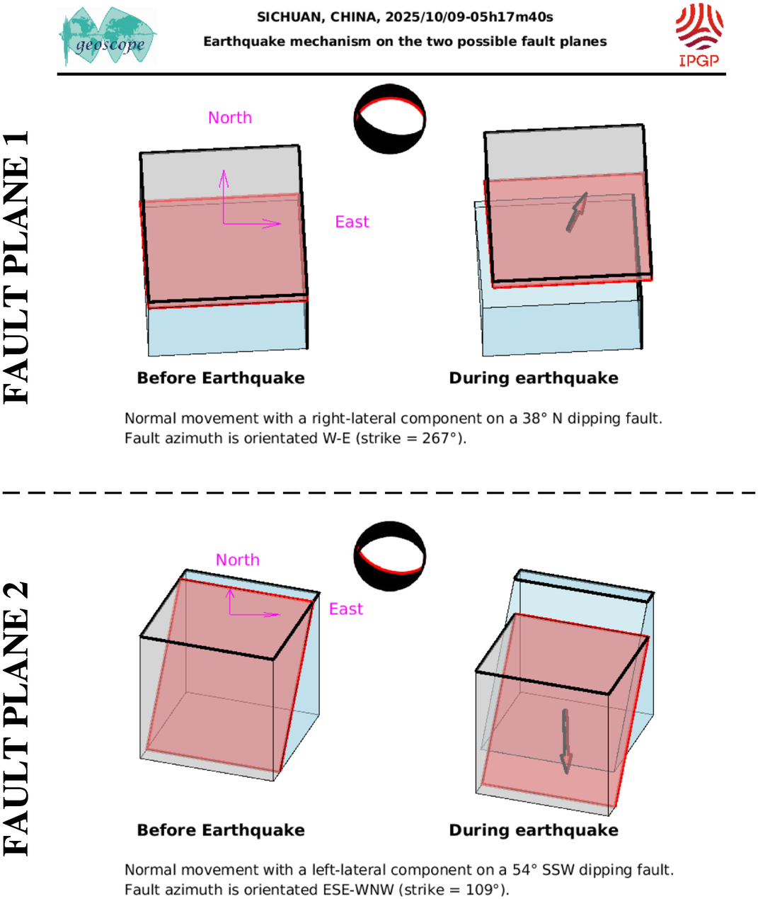 This figure illustrates how the two blocks separated by the seismic fault are displaced during the earthquake. These movements are deduced from the SCARDEC focal mechanism, on the two possible fault planes. Additional information (tectonics, near-fault measurements) is required to determine which one of these two hypotheses corresponds to the real movements during the earthquake.