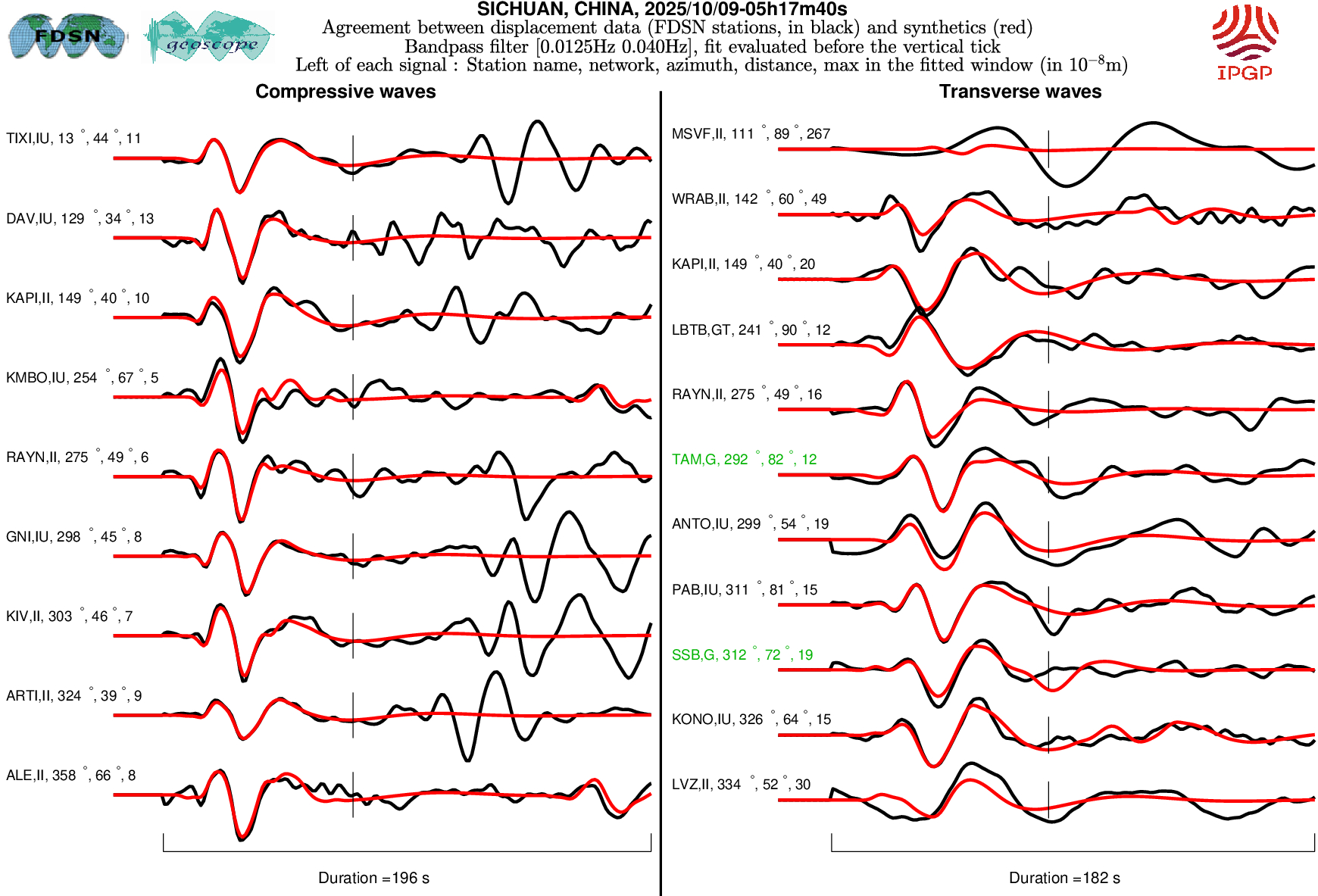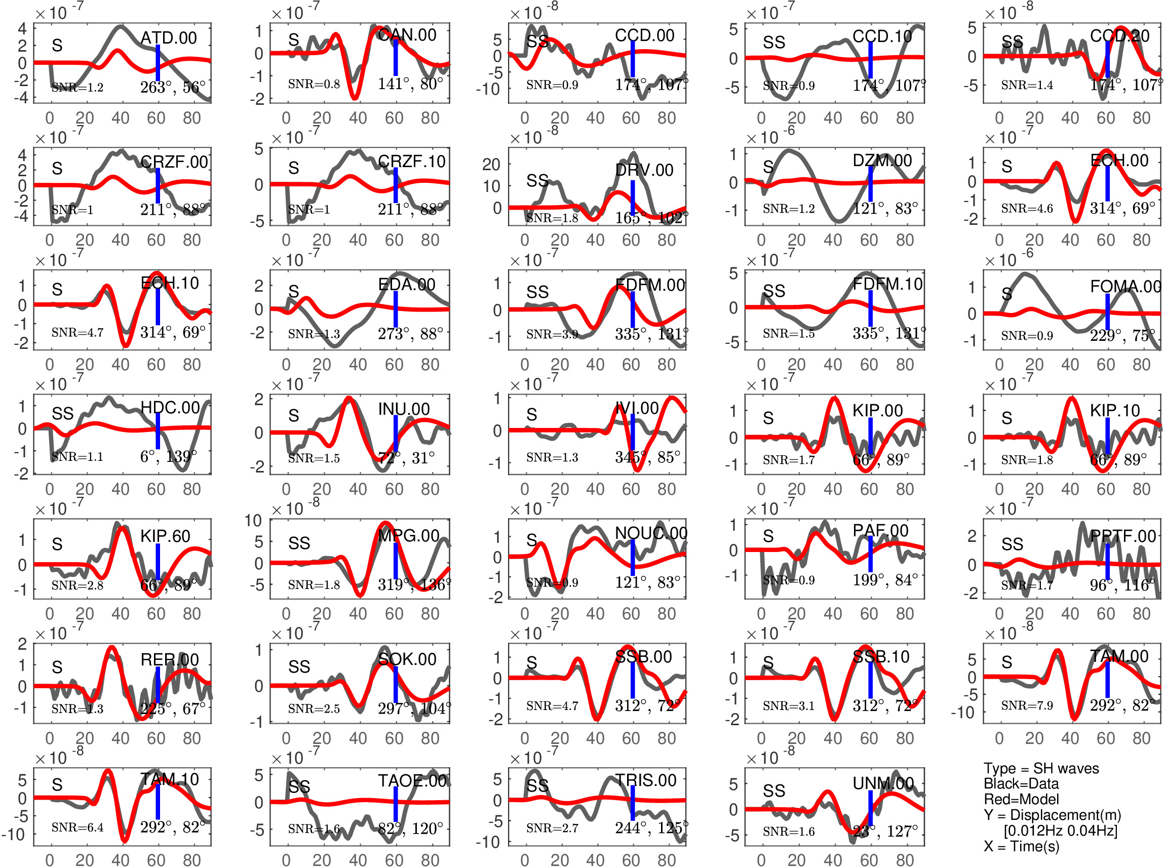 The SCARDEC solution is used here to predict the waveforms at all Geoscope stations received in real time and located at distances between 30° and 150° from the earthquake. All available location codes are used, for the BH* channels. In the range [30° - ~90°], the prediction is done on P and S(H) waves and in the range [~90° - 150°], it is done on PP and SS(H) waves. See agreement for P or PP waves (vertical components) between data and synthetics in Figure 1; see agreement for S(H) or SS(H) waves (horizontal components) between data (black) and synthetics (red) in Figure 2. Tables 1 and 2 provide quantitative estimates of these agreements.