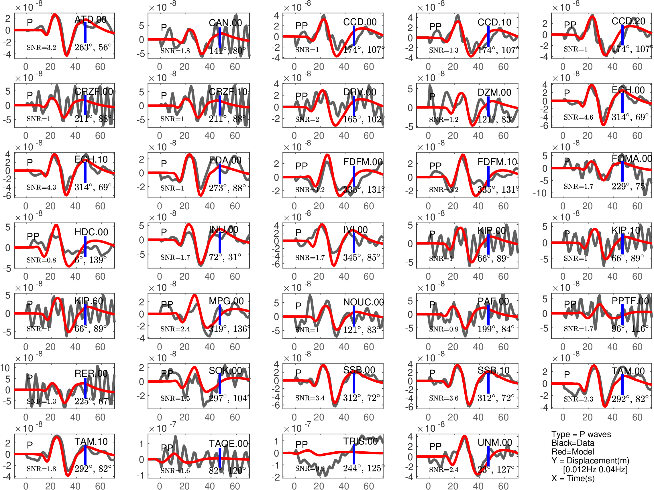 Figure 1: Agreement between data (black) and synthetics (red) for P or PP waves (the type of waves used is indicated in each subfigure). The comparison is shown with a time shift (noted 'Dt1' in Table 1), corresponding to the optimal fit ('Fit1' in Table 1) before the blue tick. Also indicated are the azimuth and distance of the station, and the signal to noise ratio (SNR). Note that the prediction done for PP waves is expected to be less accurate than the one for P waves.