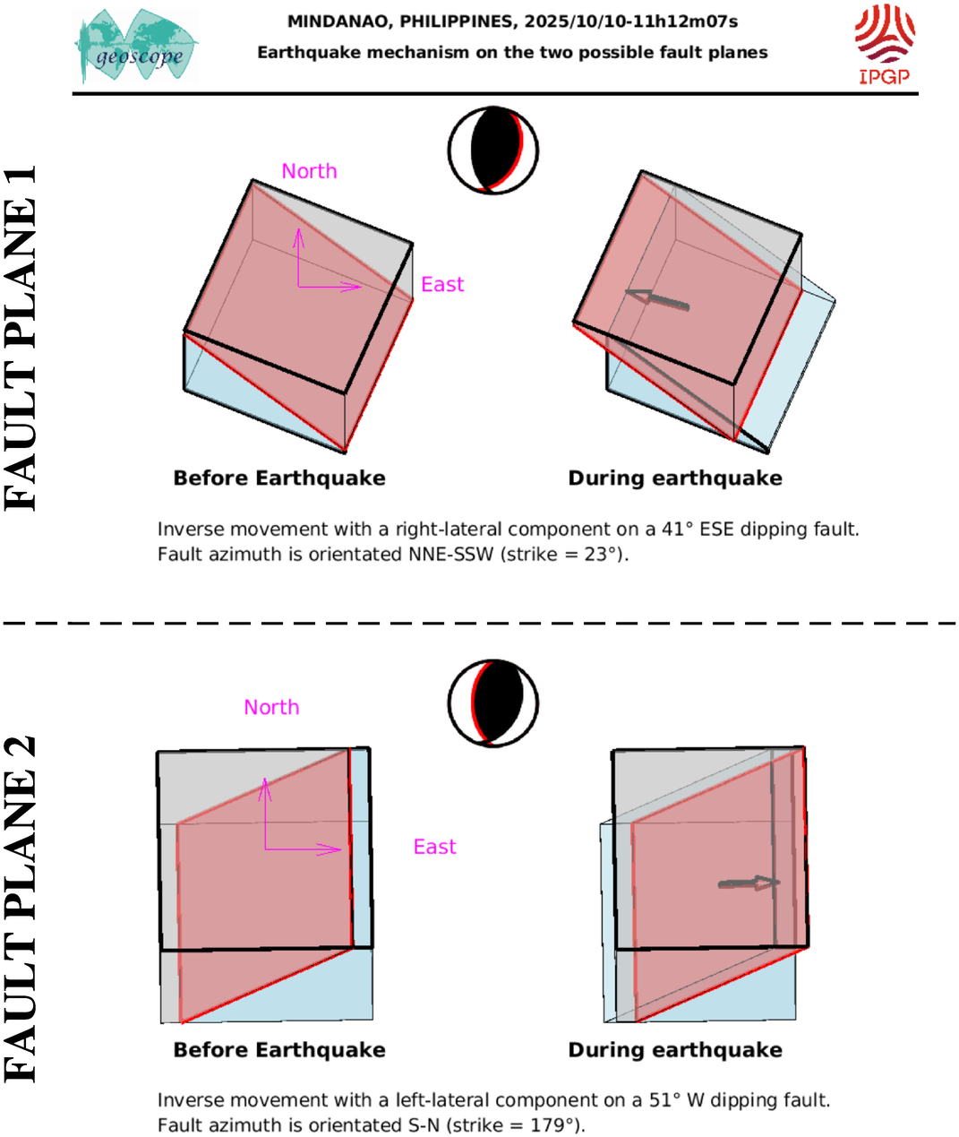 This figure illustrates how the two blocks separated by the seismic fault are displaced during the earthquake. These movements are deduced from the SCARDEC focal mechanism, on the two possible fault planes. Additional information (tectonics, near-fault measurements) is required to determine which one of these two hypotheses corresponds to the real movements during the earthquake.