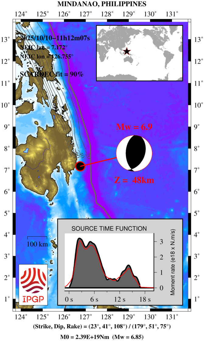 SCARDEC method: Analysis of the earthquake sourceSCARDEC method uses the teleseismic body waves to retrieve the depth, focal mechanism, moment magnitude and source time function of earthquakes with magnitudes larger than 5.5-6. Details of the methodology are described in Vallée et al. [2011] and an application to all earthquakes with magnitude larger than 6 in the period 1992-2011 can be found in Vallée [2013]. The consolidated SCARDEC catalog, with full access to earthquake parameters and source time functions, can be found here. See more information (about the data, the procedure, the reasons that could prevent from providing the earthquake information, the source time function determination...) in the "detailed notes" ![]() If using some of the SCARDEC results, please refer to: (1) Vallée, M., J. Charléty, A.M.G. Ferreira, B. Delouis, and J. Vergoz, SCARDEC : a new technique for the rapid determination of seismic moment magnitude, focal mechanism and source time functions for large earthquakes using body wave deconvolution, Geophys. J. Int., 184, 338-358, 2011. The method is running and maintained at IPGP laboratory. Apart from IPGP, past and present support to the development of the method are/were provided by the following institutes/projects :
