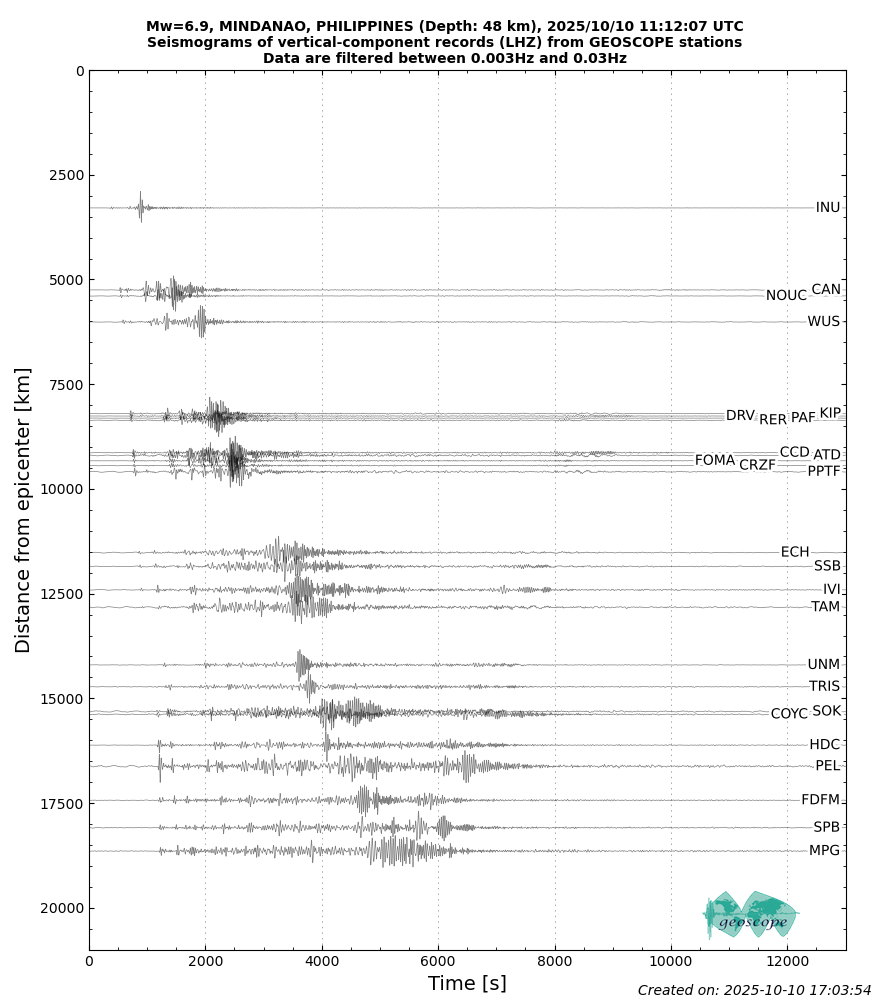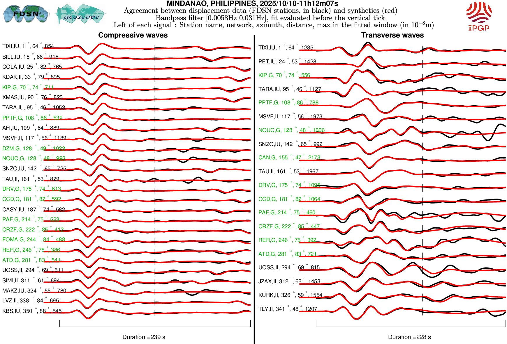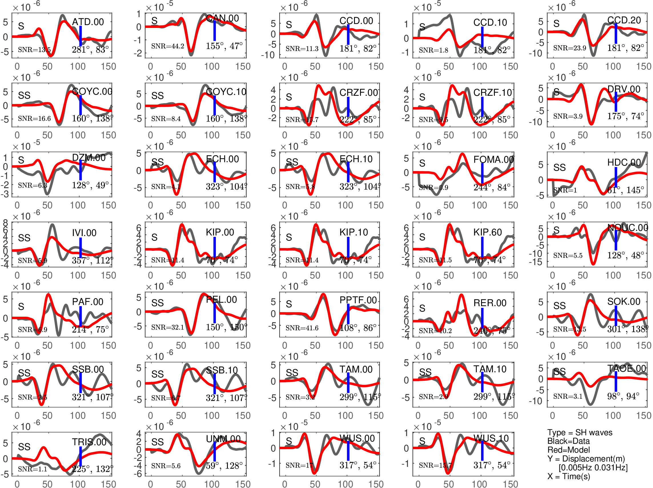 The SCARDEC solution is used here to predict the waveforms at all Geoscope stations received in real time and located at distances between 30° and 150° from the earthquake. All available location codes are used, for the BH* channels. In the range [30° - ~90°], the prediction is done on P and S(H) waves and in the range [~90° - 150°], it is done on PP and SS(H) waves. See agreement for P or PP waves (vertical components) between data and synthetics in Figure 1; see agreement for S(H) or SS(H) waves (horizontal components) between data (black) and synthetics (red) in Figure 2. Tables 1 and 2 provide quantitative estimates of these agreements.