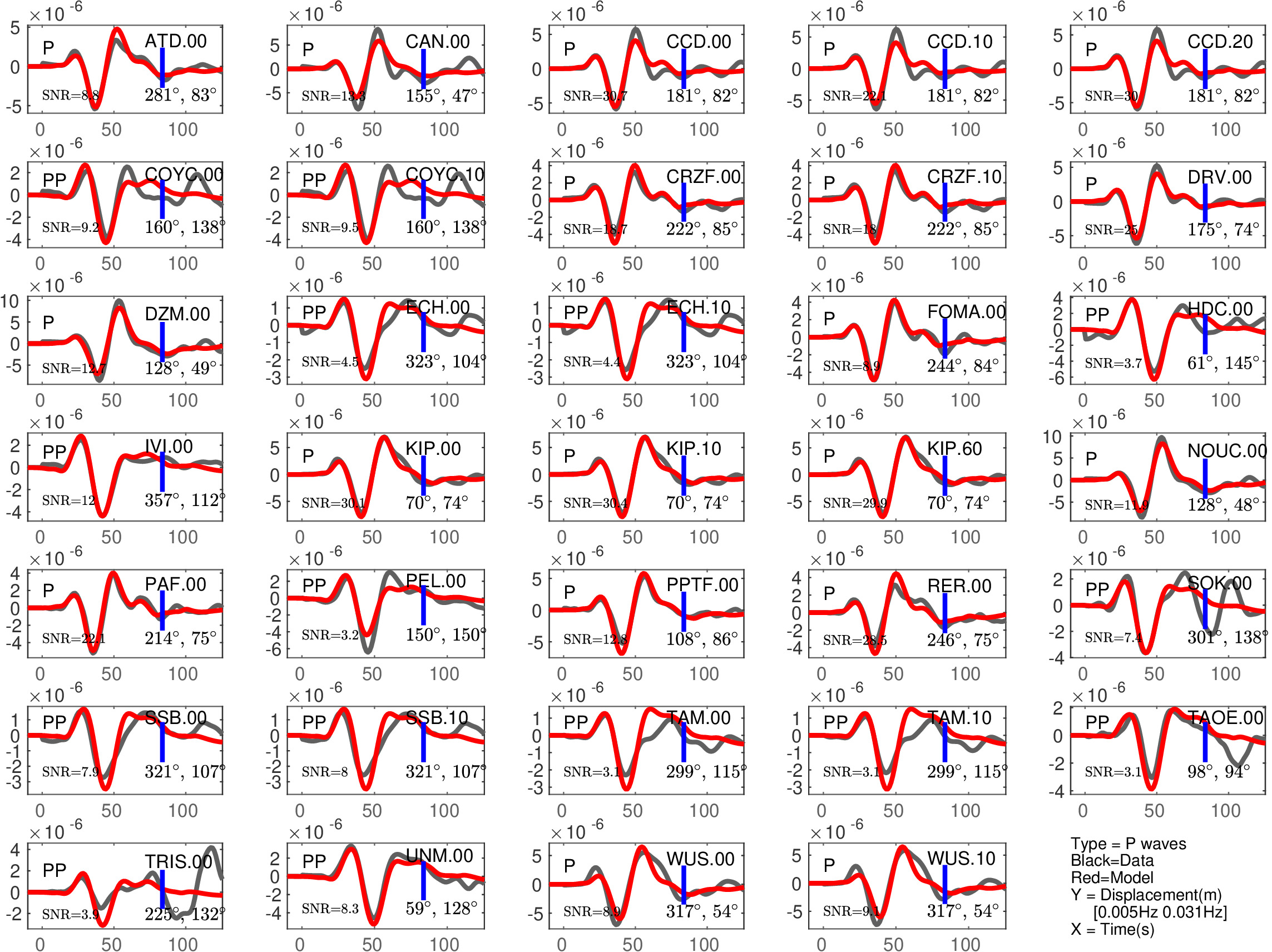 Figure 1: Agreement between data (black) and synthetics (red) for P or PP waves (the type of waves used is indicated in each subfigure). The comparison is shown with a time shift (noted 'Dt1' in Table 1), corresponding to the optimal fit ('Fit1' in Table 1) before the blue tick. Also indicated are the azimuth and distance of the station, and the signal to noise ratio (SNR). Note that the prediction done for PP waves is expected to be less accurate than the one for P waves.