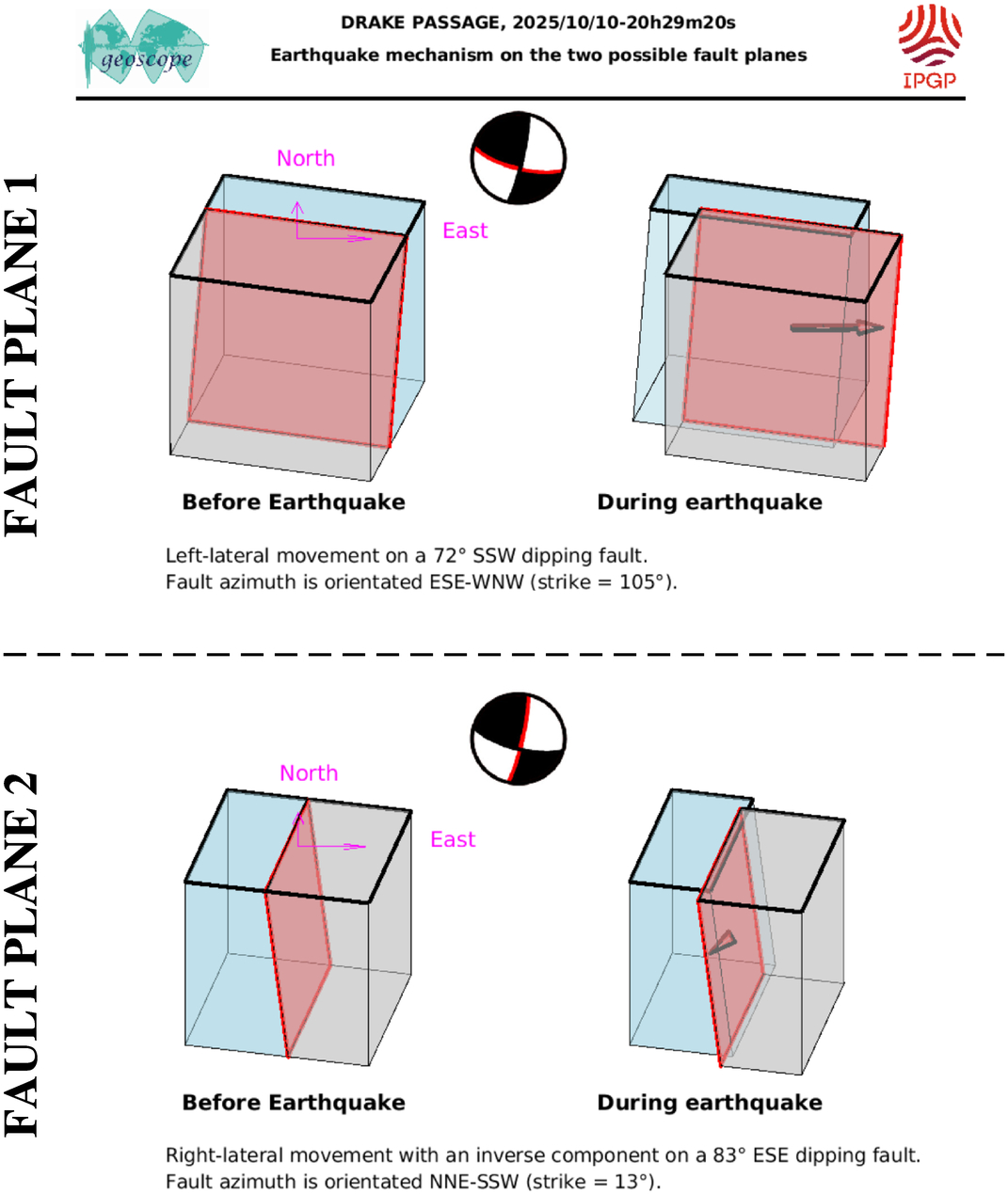 This figure illustrates how the two blocks separated by the seismic fault are displaced during the earthquake. These movements are deduced from the SCARDEC focal mechanism, on the two possible fault planes. Additional information (tectonics, near-fault measurements) is required to determine which one of these two hypotheses corresponds to the real movements during the earthquake.