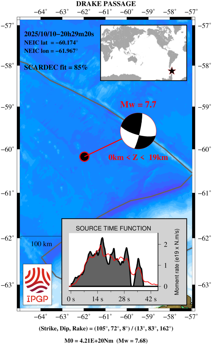 SCARDEC method: Analysis of the earthquake sourceSCARDEC method uses the teleseismic body waves to retrieve the depth, focal mechanism, moment magnitude and source time function of earthquakes with magnitudes larger than 5.5-6. Details of the methodology are described in Vallée et al. [2011] and an application to all earthquakes with magnitude larger than 6 in the period 1992-2011 can be found in Vallée [2013]. The consolidated SCARDEC catalog, with full access to earthquake parameters and source time functions, can be found here. See more information (about the data, the procedure, the reasons that could prevent from providing the earthquake information, the source time function determination...) in the "detailed notes" ![]() If using some of the SCARDEC results, please refer to: (1) Vallée, M., J. Charléty, A.M.G. Ferreira, B. Delouis, and J. Vergoz, SCARDEC : a new technique for the rapid determination of seismic moment magnitude, focal mechanism and source time functions for large earthquakes using body wave deconvolution, Geophys. J. Int., 184, 338-358, 2011. The method is running and maintained at IPGP laboratory. Apart from IPGP, past and present support to the development of the method are/were provided by the following institutes/projects :
