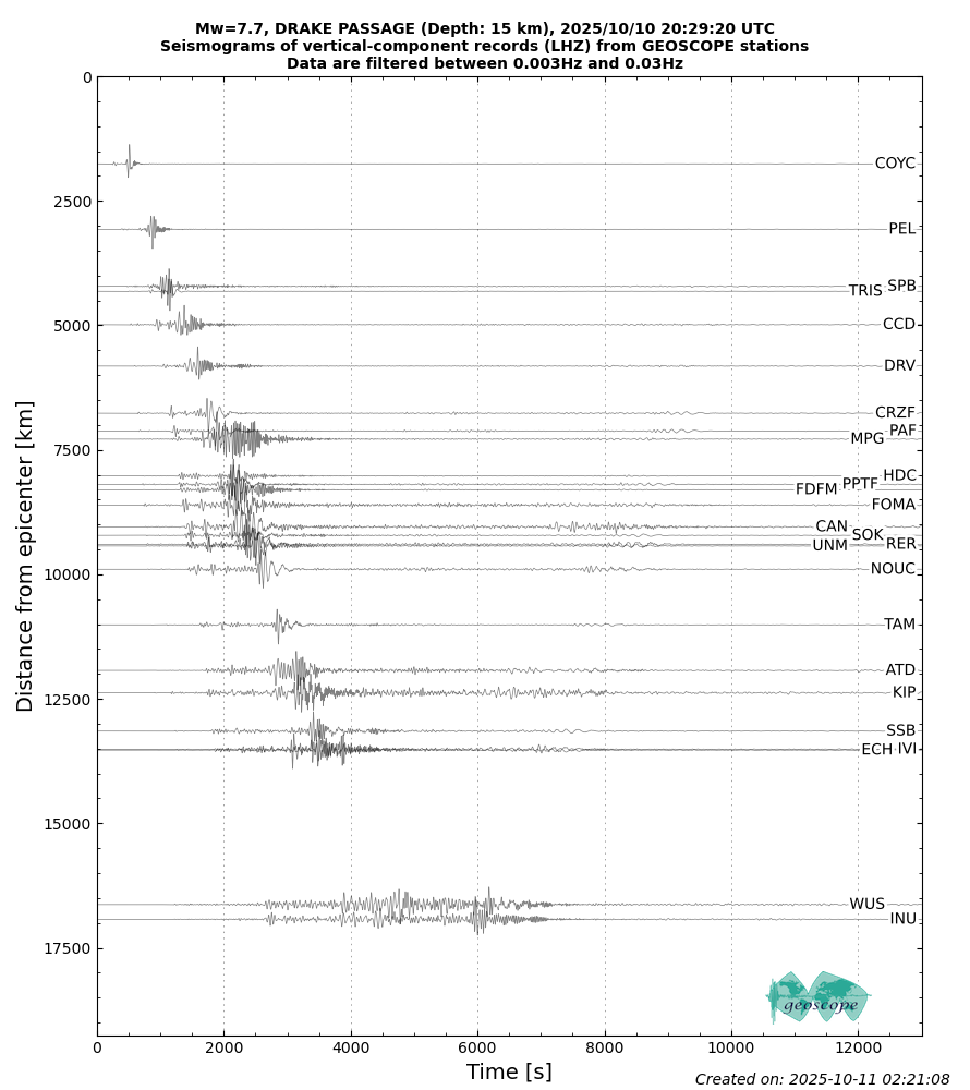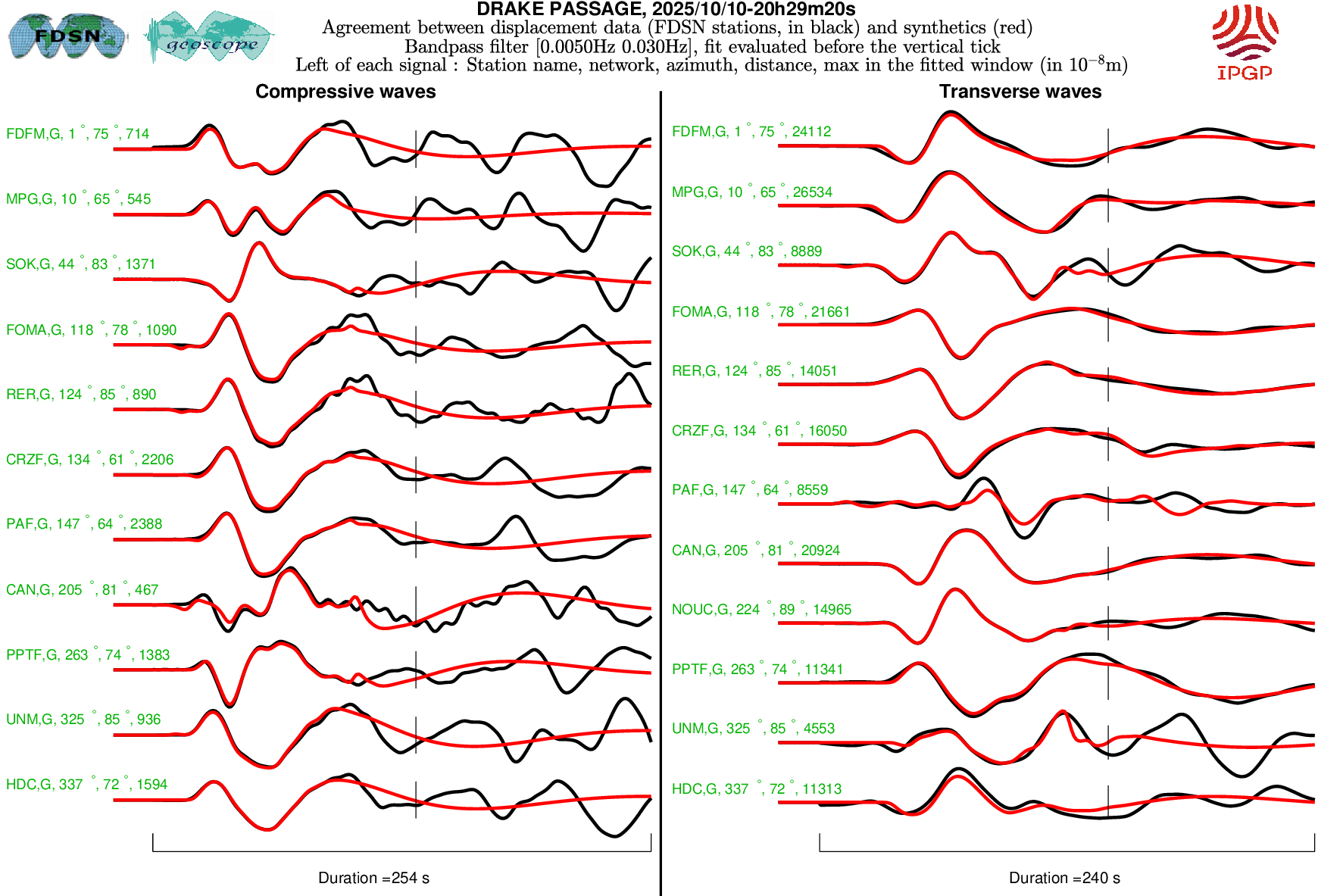 The SCARDEC solution is used here to predict the waveforms at all Geoscope stations received in real time and located at distances between 30° and 150° from the earthquake. All available location codes are used, for the BH* channels. In the range [30° - ~90°], the prediction is done on P and S(H) waves and in the range [~90° - 150°], it is done on PP and SS(H) waves. See agreement for P or PP waves (vertical components) between data and synthetics in Figure 1; see agreement for S(H) or SS(H) waves (horizontal components) between data (black) and synthetics (red) in Figure 2. Tables 1 and 2 provide quantitative estimates of these agreements.