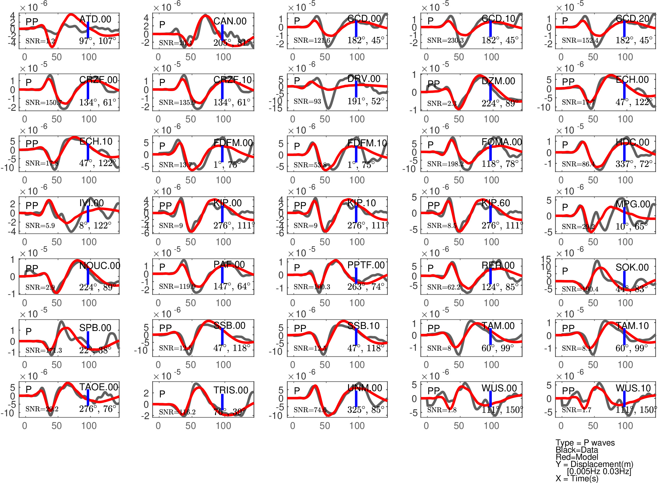 Figure 1: Agreement between data (black) and synthetics (red) for P or PP waves (the type of waves used is indicated in each subfigure). The comparison is shown with a time shift (noted 'Dt1' in Table 1), corresponding to the optimal fit ('Fit1' in Table 1) before the blue tick. Also indicated are the azimuth and distance of the station, and the signal to noise ratio (SNR). Note that the prediction done for PP waves is expected to be less accurate than the one for P waves.