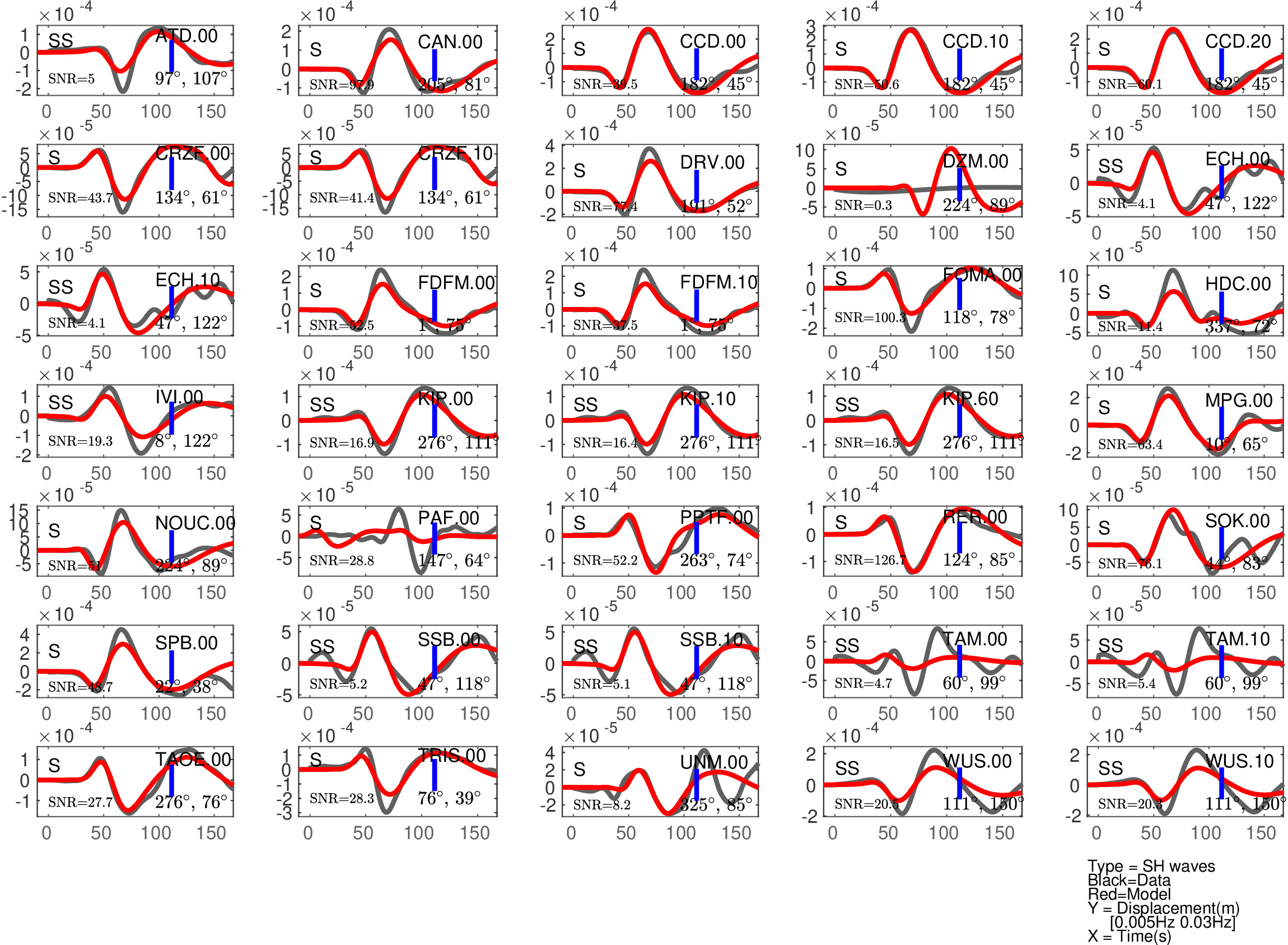 Figure 2: Same as Figure 1, but for S(H) or SS(H) waves (use of the rotated horizontal component along the transverse direction). See in Table 2 the quantitative estimates ('Dt1' and 'Fit1') corresponding to this Figure.