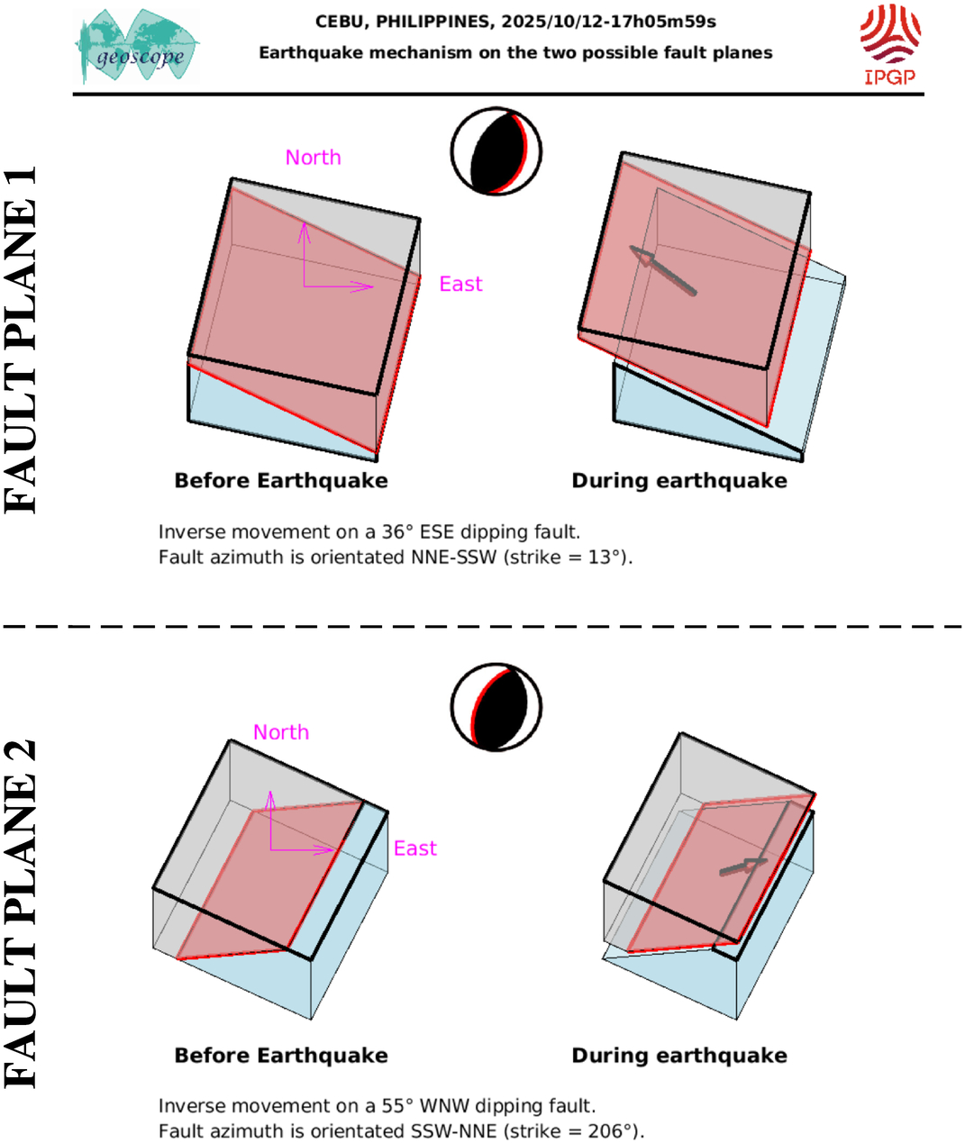 This figure illustrates how the two blocks separated by the seismic fault are displaced during the earthquake. These movements are deduced from the SCARDEC focal mechanism, on the two possible fault planes. Additional information (tectonics, near-fault measurements) is required to determine which one of these two hypotheses corresponds to the real movements during the earthquake.