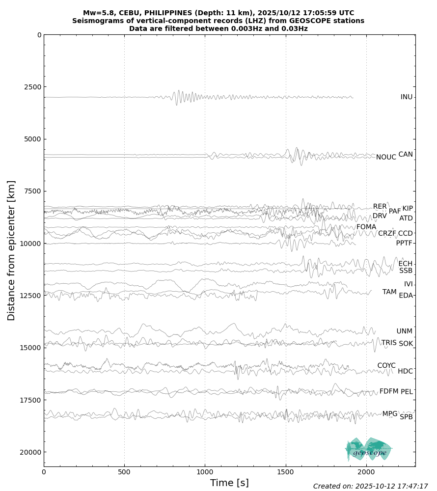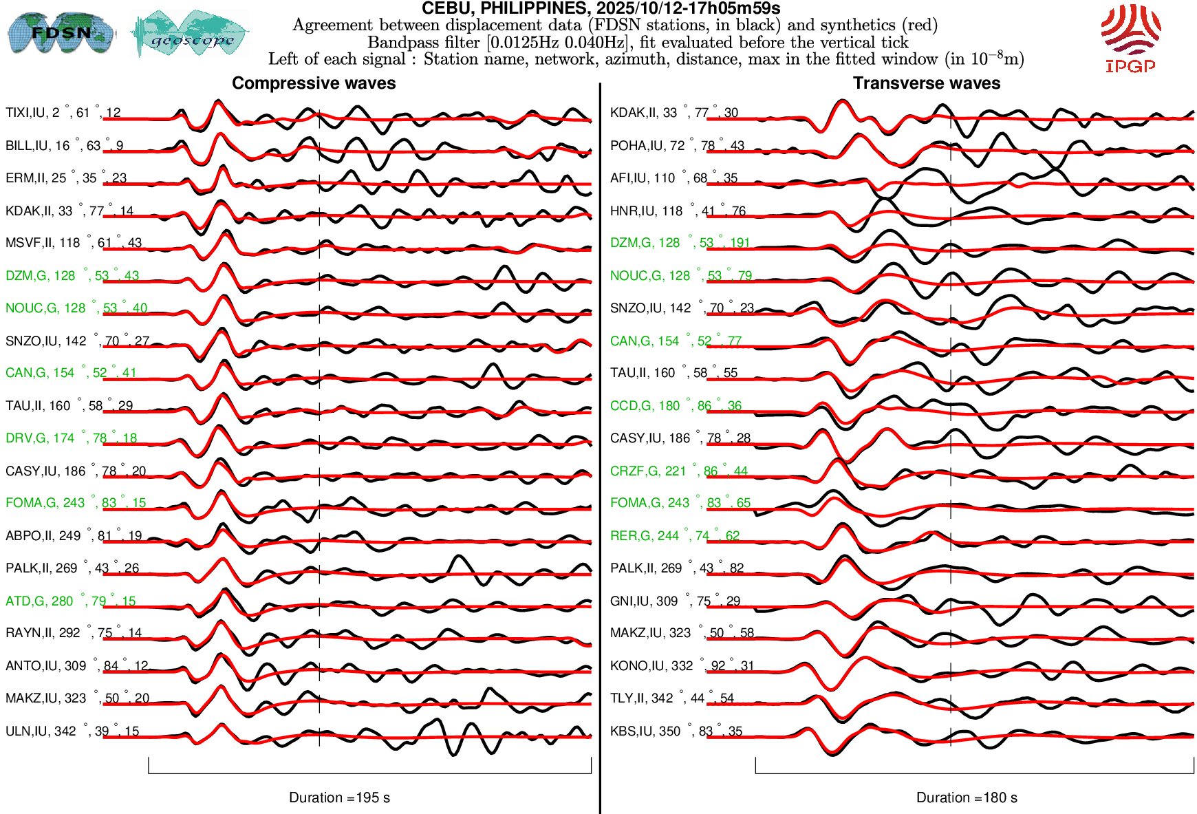 The SCARDEC solution is used here to predict the waveforms at all Geoscope stations received in real time and located at distances between 30° and 150° from the earthquake. All available location codes are used, for the BH* channels. In the range [30° - ~90°], the prediction is done on P and S(H) waves and in the range [~90° - 150°], it is done on PP and SS(H) waves. See agreement for P or PP waves (vertical components) between data and synthetics in Figure 1; see agreement for S(H) or SS(H) waves (horizontal components) between data (black) and synthetics (red) in Figure 2. Tables 1 and 2 provide quantitative estimates of these agreements.