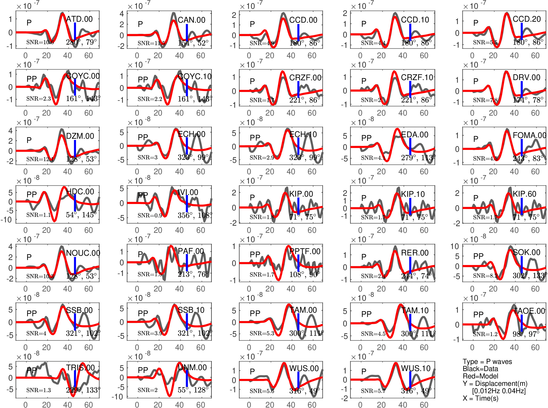 Figure 1: Agreement between data (black) and synthetics (red) for P or PP waves (the type of waves used is indicated in each subfigure). The comparison is shown with a time shift (noted 'Dt1' in Table 1), corresponding to the optimal fit ('Fit1' in Table 1) before the blue tick. Also indicated are the azimuth and distance of the station, and the signal to noise ratio (SNR). Note that the prediction done for PP waves is expected to be less accurate than the one for P waves.