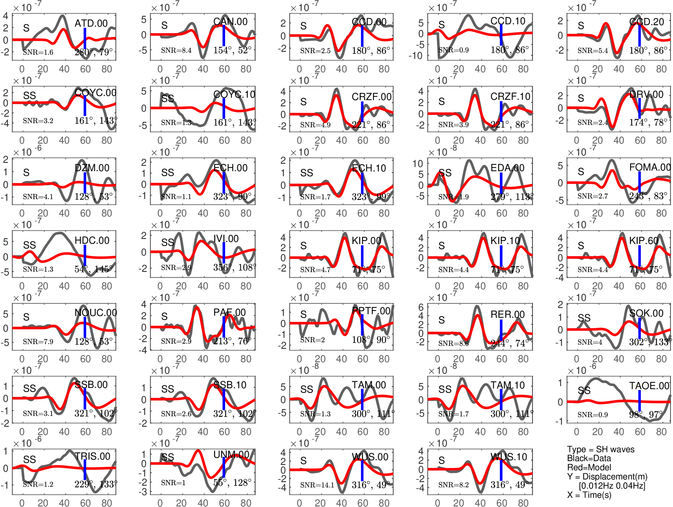 Figure 2: Same as Figure 1, but for S(H) or SS(H) waves (use of the rotated horizontal component along the transverse direction). See in Table 2 the quantitative estimates ('Dt1' and 'Fit1') corresponding to this Figure.