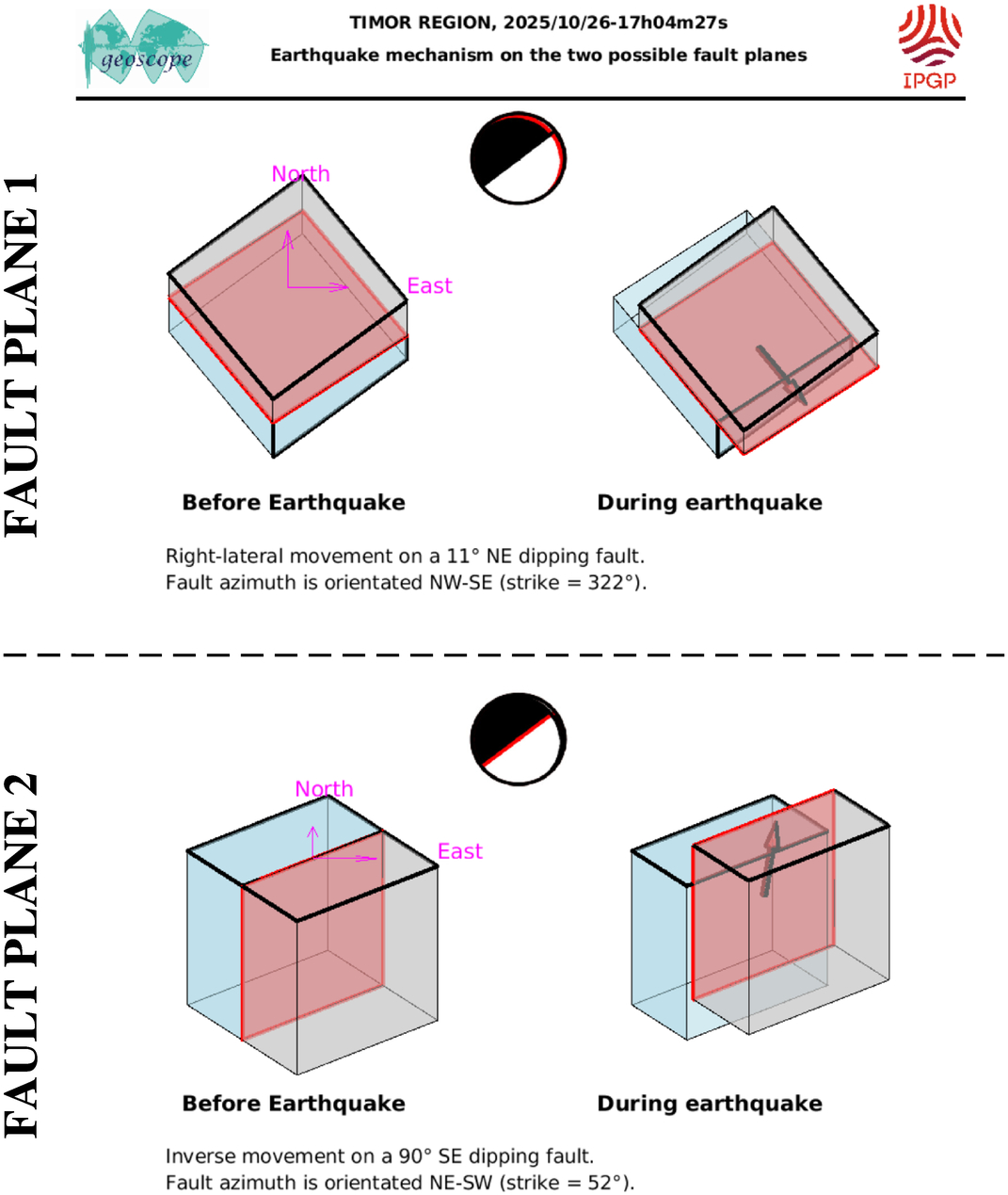 This figure illustrates how the two blocks separated by the seismic fault are displaced during the earthquake. These movements are deduced from the SCARDEC focal mechanism, on the two possible fault planes. Additional information (tectonics, near-fault measurements) is required to determine which one of these two hypotheses corresponds to the real movements during the earthquake.