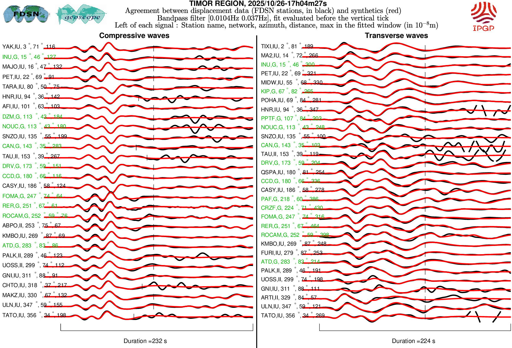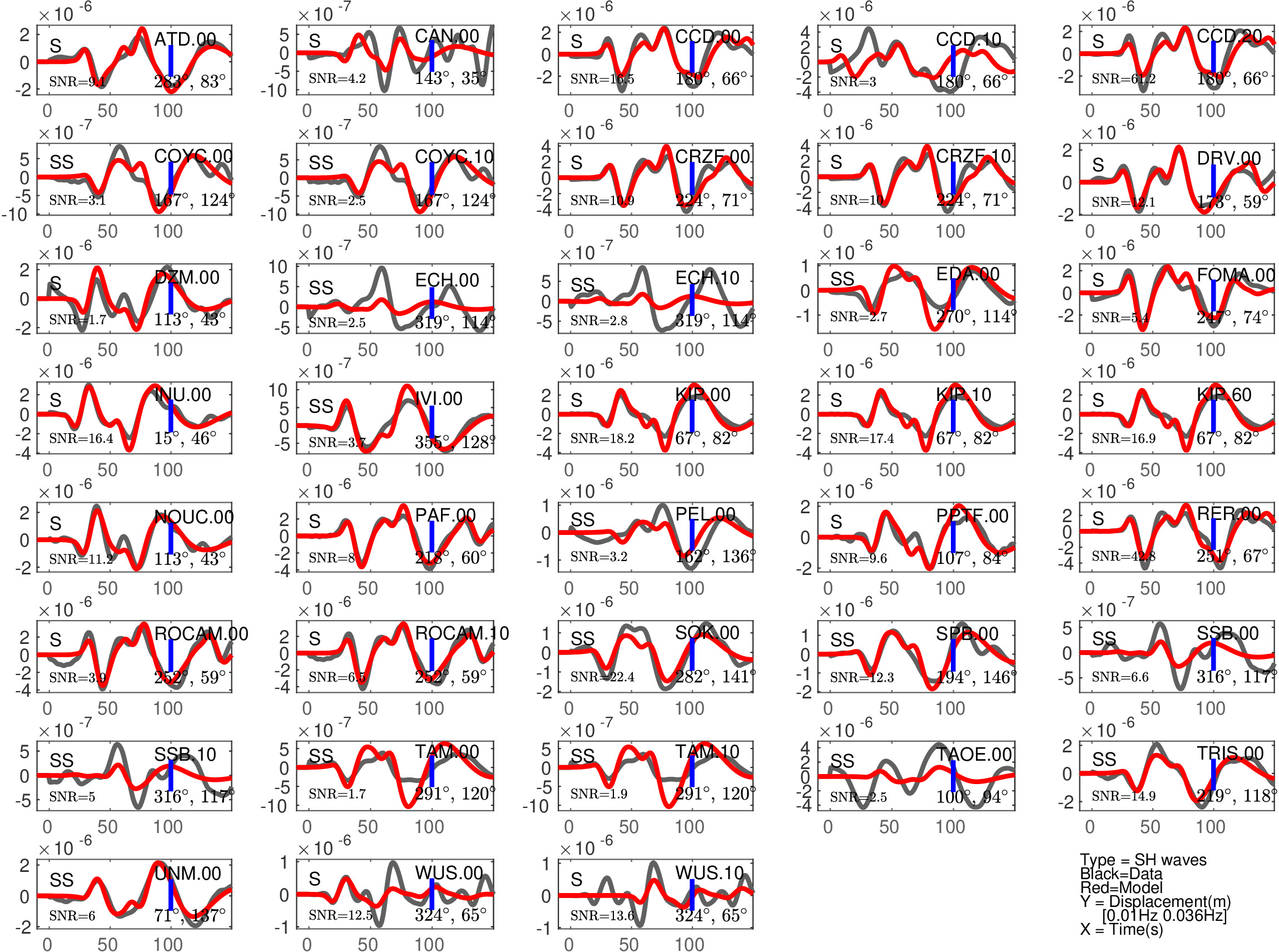 The SCARDEC solution is used here to predict the waveforms at all Geoscope stations received in real time and located at distances between 30° and 150° from the earthquake. All available location codes are used, for the BH* channels. In the range [30° - ~90°], the prediction is done on P and S(H) waves and in the range [~90° - 150°], it is done on PP and SS(H) waves. See agreement for P or PP waves (vertical components) between data and synthetics in Figure 1; see agreement for S(H) or SS(H) waves (horizontal components) between data (black) and synthetics (red) in Figure 2. Tables 1 and 2 provide quantitative estimates of these agreements.