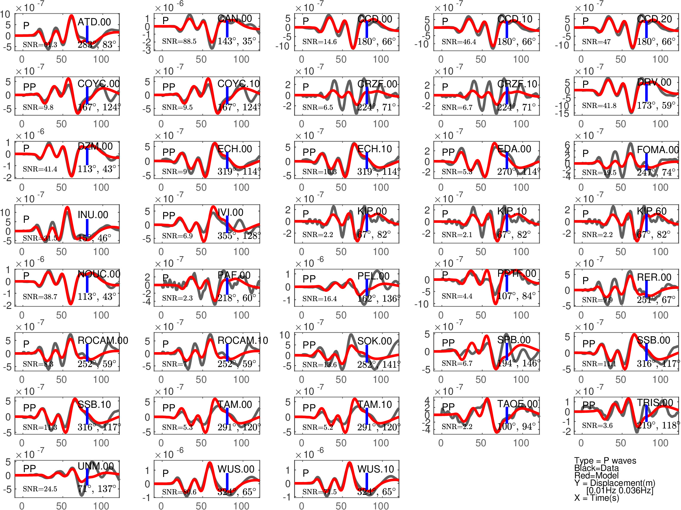 Figure 1: Agreement between data (black) and synthetics (red) for P or PP waves (the type of waves used is indicated in each subfigure). The comparison is shown with a time shift (noted 'Dt1' in Table 1), corresponding to the optimal fit ('Fit1' in Table 1) before the blue tick. Also indicated are the azimuth and distance of the station, and the signal to noise ratio (SNR). Note that the prediction done for PP waves is expected to be less accurate than the one for P waves.