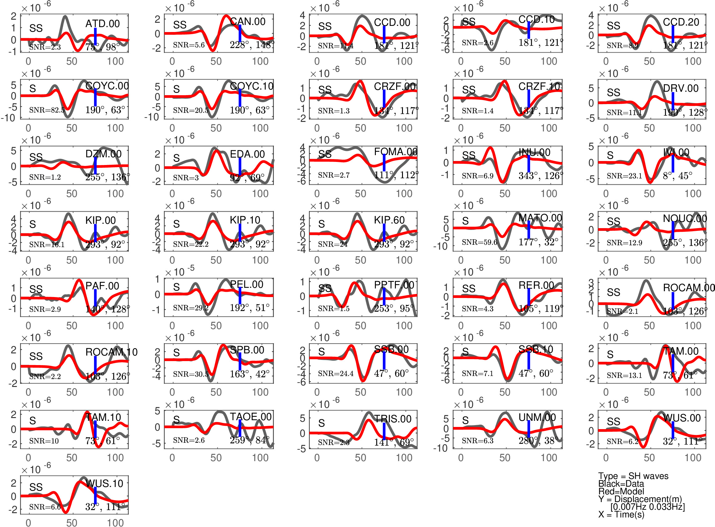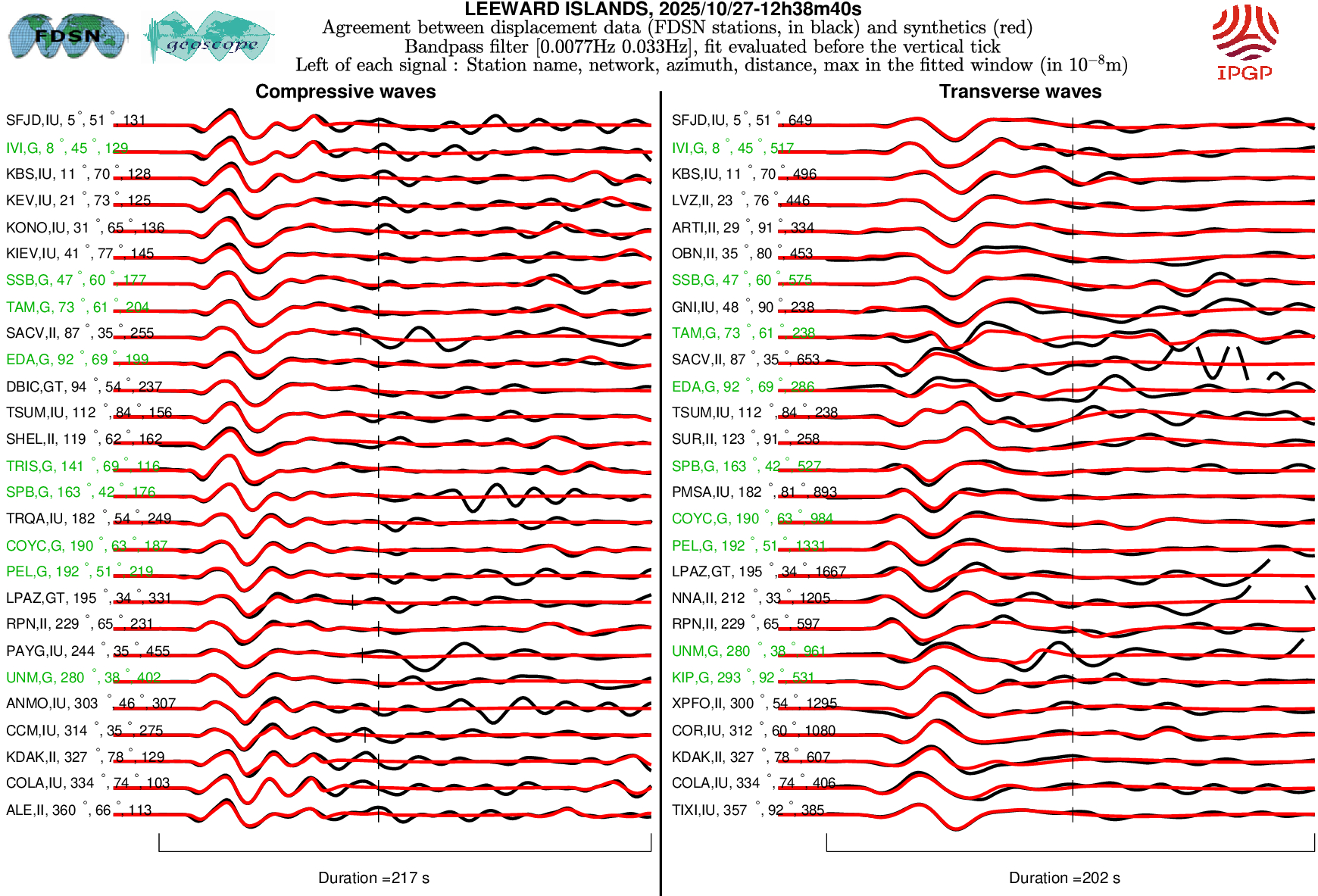 The SCARDEC solution is used here to predict the waveforms at all Geoscope stations received in real time and located at distances between 30° and 150° from the earthquake. All available location codes are used, for the BH* channels. In the range [30° - ~90°], the prediction is done on P and S(H) waves and in the range [~90° - 150°], it is done on PP and SS(H) waves. See agreement for P or PP waves (vertical components) between data and synthetics in Figure 1; see agreement for S(H) or SS(H) waves (horizontal components) between data (black) and synthetics (red) in Figure 2. Tables 1 and 2 provide quantitative estimates of these agreements.
