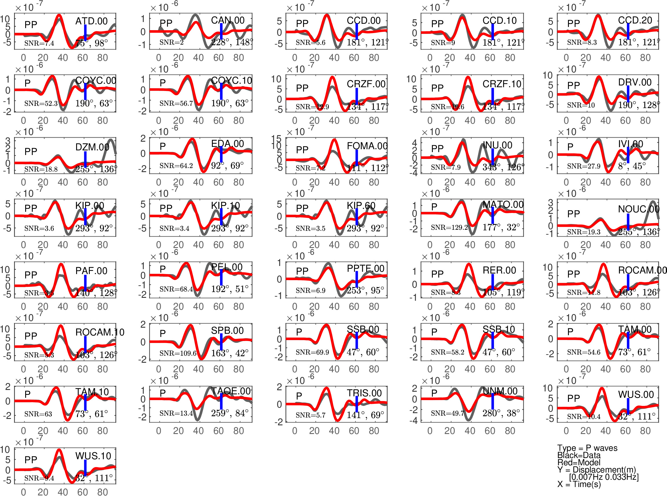 Figure 1: Agreement between data (black) and synthetics (red) for P or PP waves (the type of waves used is indicated in each subfigure). The comparison is shown with a time shift (noted 'Dt1' in Table 1), corresponding to the optimal fit ('Fit1' in Table 1) before the blue tick. Also indicated are the azimuth and distance of the station, and the signal to noise ratio (SNR). Note that the prediction done for PP waves is expected to be less accurate than the one for P waves.