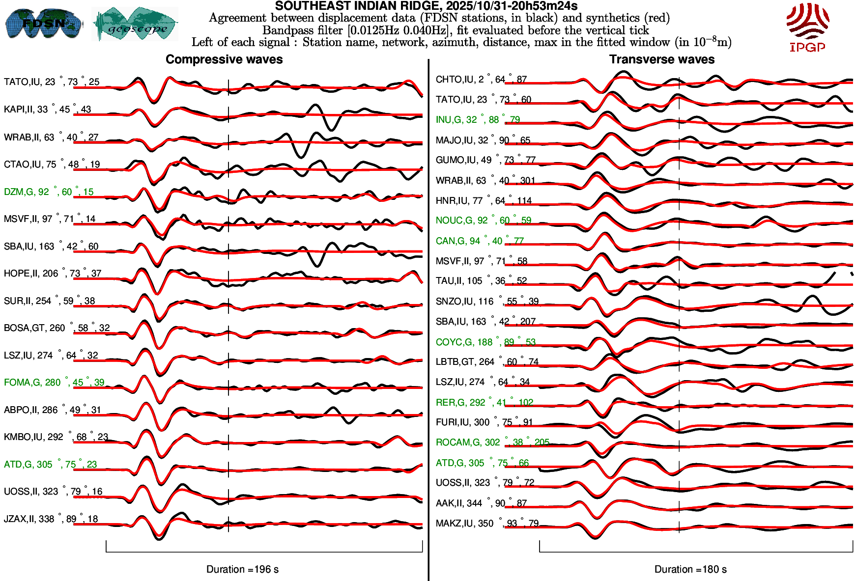 The SCARDEC solution is used here to predict the waveforms at all Geoscope stations received in real time and located at distances between 30° and 150° from the earthquake. All available location codes are used, for the BH* channels. In the range [30° - ~90°], the prediction is done on P and S(H) waves and in the range [~90° - 150°], it is done on PP and SS(H) waves. See agreement for P or PP waves (vertical components) between data and synthetics in Figure 1; see agreement for S(H) or SS(H) waves (horizontal components) between data (black) and synthetics (red) in Figure 2. Tables 1 and 2 provide quantitative estimates of these agreements.