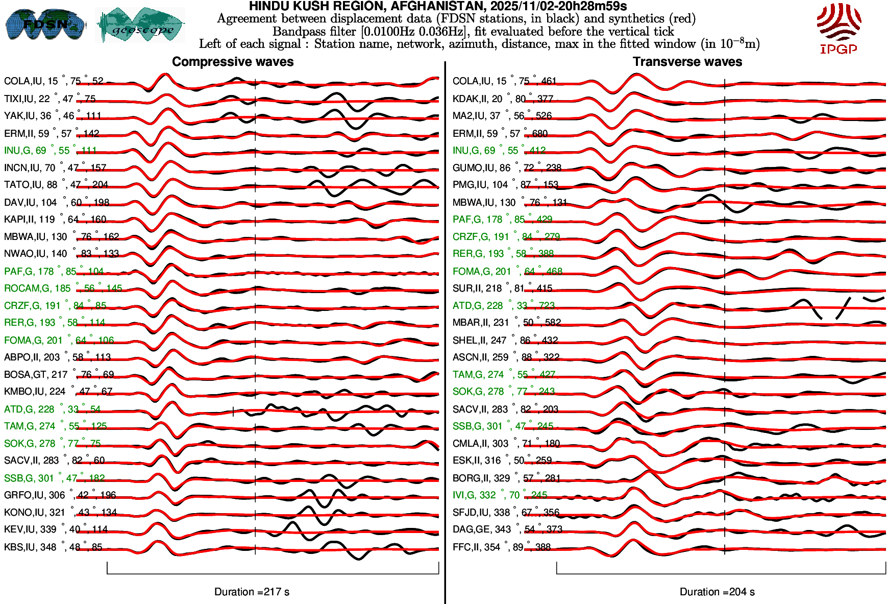 The SCARDEC solution is used here to predict the waveforms at all Geoscope stations received in real time and located at distances between 30° and 150° from the earthquake. All available location codes are used, for the BH* channels. In the range [30° - ~90°], the prediction is done on P and S(H) waves and in the range [~90° - 150°], it is done on PP and SS(H) waves. See agreement for P or PP waves (vertical components) between data and synthetics in Figure 1; see agreement for S(H) or SS(H) waves (horizontal components) between data (black) and synthetics (red) in Figure 2. Tables 1 and 2 provide quantitative estimates of these agreements.