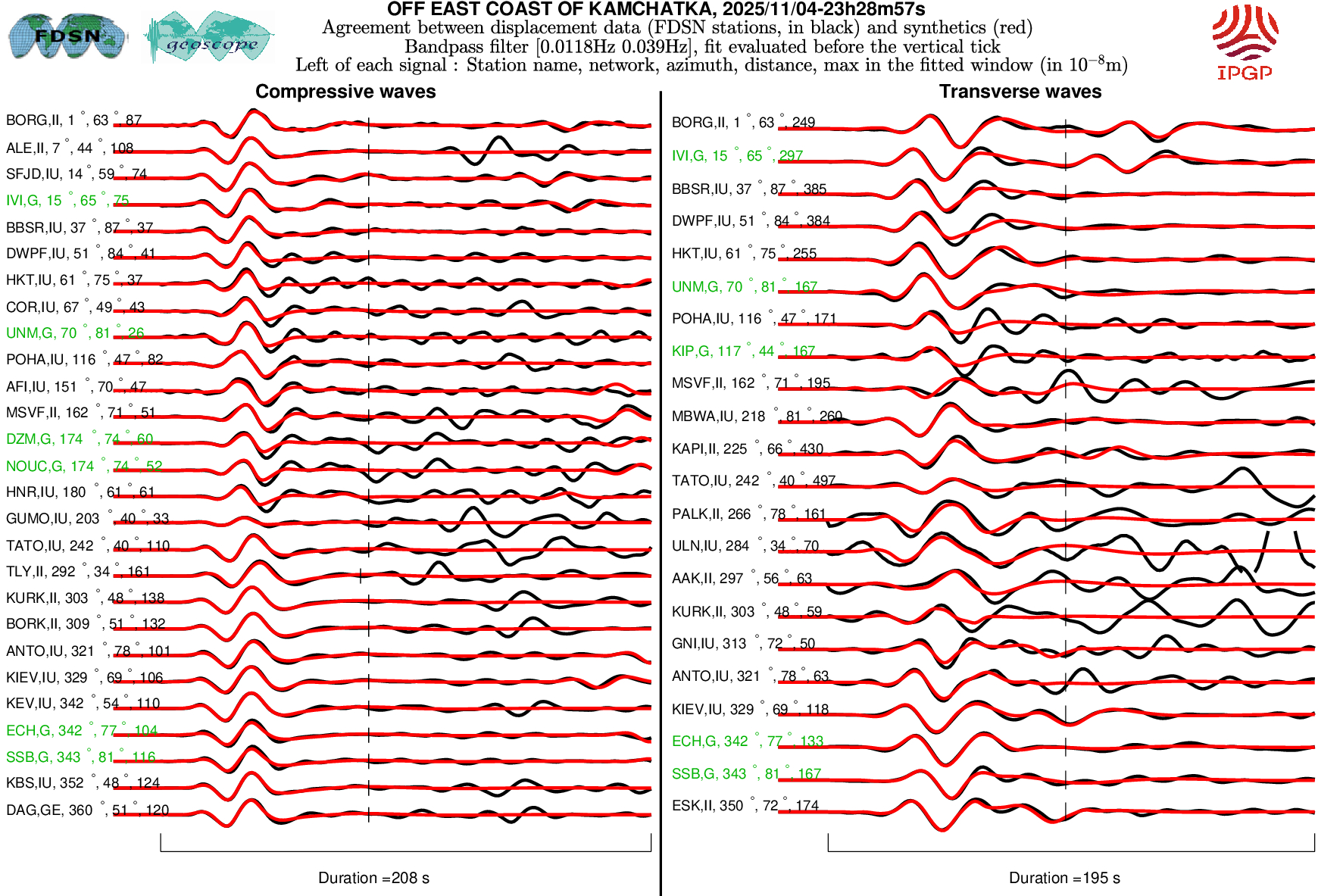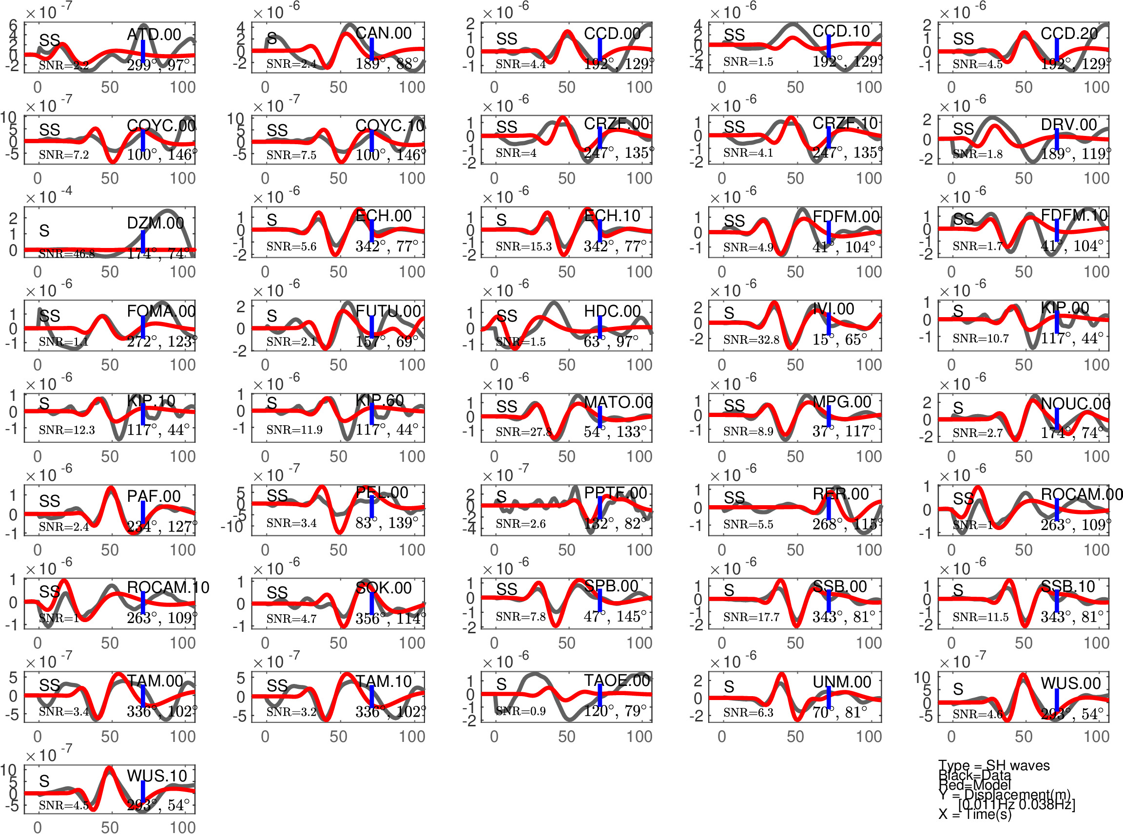 The SCARDEC solution is used here to predict the waveforms at all Geoscope stations received in real time and located at distances between 30° and 150° from the earthquake. All available location codes are used, for the BH* channels. In the range [30° - ~90°], the prediction is done on P and S(H) waves and in the range [~90° - 150°], it is done on PP and SS(H) waves. See agreement for P or PP waves (vertical components) between data and synthetics in Figure 1; see agreement for S(H) or SS(H) waves (horizontal components) between data (black) and synthetics (red) in Figure 2. Tables 1 and 2 provide quantitative estimates of these agreements.
