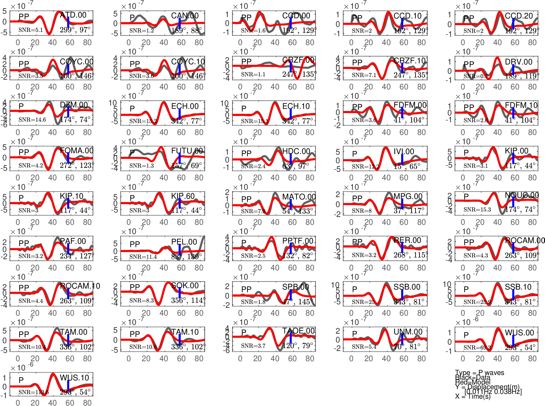 Figure 1: Agreement between data (black) and synthetics (red) for P or PP waves (the type of waves used is indicated in each subfigure). The comparison is shown with a time shift (noted 'Dt1' in Table 1), corresponding to the optimal fit ('Fit1' in Table 1) before the blue tick. Also indicated are the azimuth and distance of the station, and the signal to noise ratio (SNR). Note that the prediction done for PP waves is expected to be less accurate than the one for P waves.