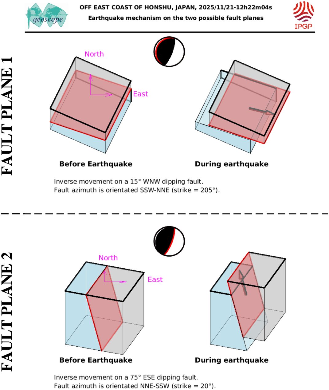 This figure illustrates how the two blocks separated by the seismic fault are displaced during the earthquake. These movements are deduced from the SCARDEC focal mechanism, on the two possible fault planes. Additional information (tectonics, near-fault measurements) is required to determine which one of these two hypotheses corresponds to the real movements during the earthquake.