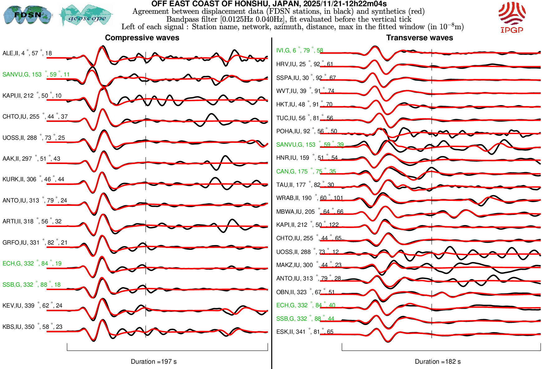 The SCARDEC solution is used here to predict the waveforms at all Geoscope stations received in real time and located at distances between 30° and 150° from the earthquake. All available location codes are used, for the BH* channels. In the range [30° - ~90°], the prediction is done on P and S(H) waves and in the range [~90° - 150°], it is done on PP and SS(H) waves. See agreement for P or PP waves (vertical components) between data and synthetics in Figure 1; see agreement for S(H) or SS(H) waves (horizontal components) between data (black) and synthetics (red) in Figure 2. Tables 1 and 2 provide quantitative estimates of these agreements.