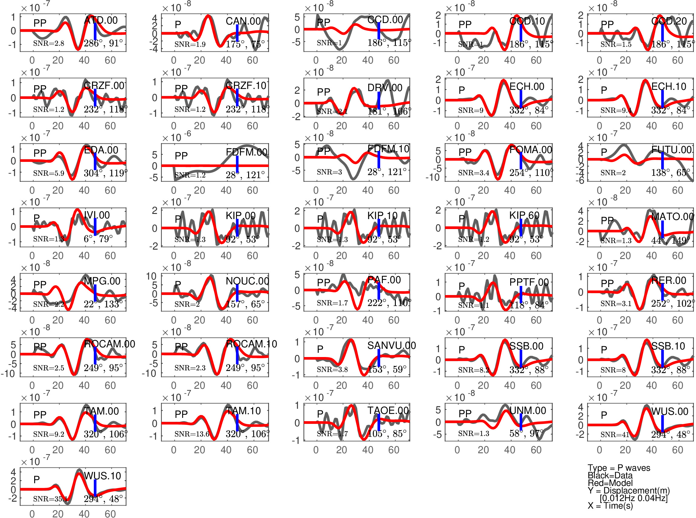 Figure 1: Agreement between data (black) and synthetics (red) for P or PP waves (the type of waves used is indicated in each subfigure). The comparison is shown with a time shift (noted 'Dt1' in Table 1), corresponding to the optimal fit ('Fit1' in Table 1) before the blue tick. Also indicated are the azimuth and distance of the station, and the signal to noise ratio (SNR). Note that the prediction done for PP waves is expected to be less accurate than the one for P waves.