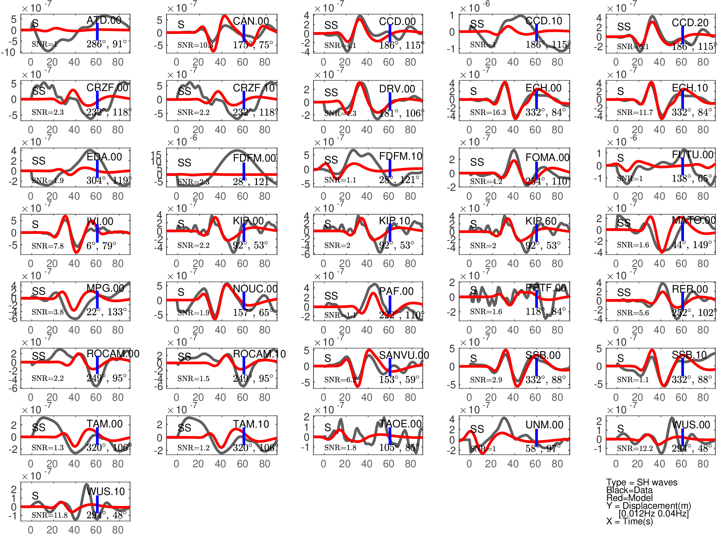 Figure 2: Same as Figure 1, but for S(H) or SS(H) waves (use of the rotated horizontal component along the transverse direction). See in Table 2 the quantitative estimates ('Dt1' and 'Fit1') corresponding to this Figure.