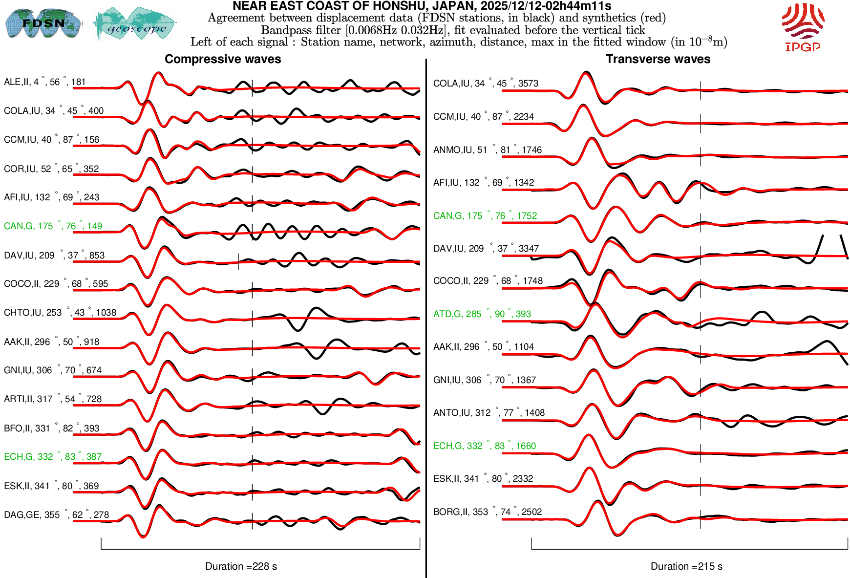 The SCARDEC solution is used here to predict the waveforms at all Geoscope stations received in real time and located at distances between 30° and 150° from the earthquake. All available location codes are used, for the BH* channels. In the range [30° - ~90°], the prediction is done on P and S(H) waves and in the range [~90° - 150°], it is done on PP and SS(H) waves. See agreement for P or PP waves (vertical components) between data and synthetics in Figure 1; see agreement for S(H) or SS(H) waves (horizontal components) between data (black) and synthetics (red) in Figure 2. Tables 1 and 2 provide quantitative estimates of these agreements.