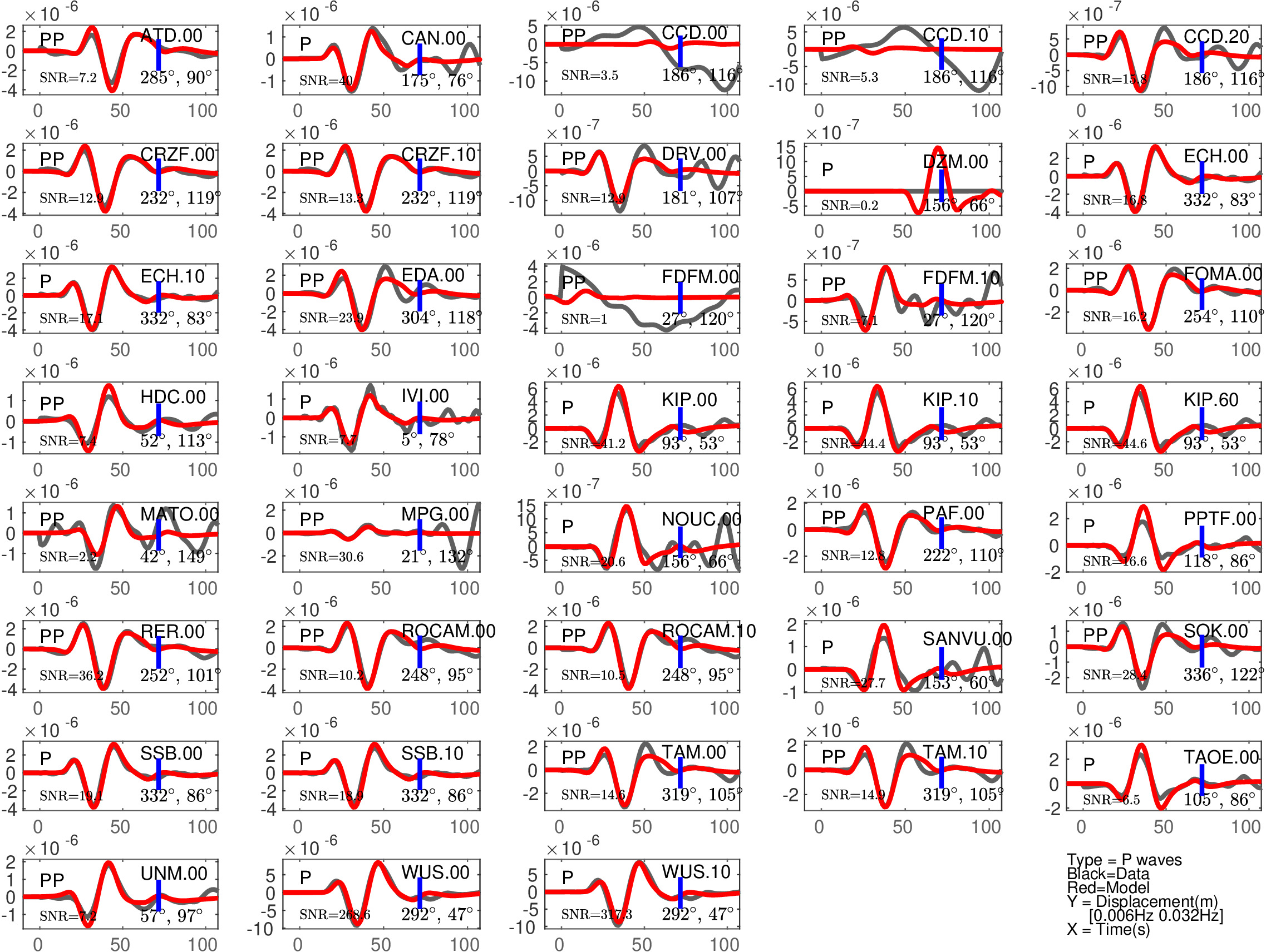 Figure 1: Agreement between data (black) and synthetics (red) for P or PP waves (the type of waves used is indicated in each subfigure). The comparison is shown with a time shift (noted 'Dt1' in Table 1), corresponding to the optimal fit ('Fit1' in Table 1) before the blue tick. Also indicated are the azimuth and distance of the station, and the signal to noise ratio (SNR). Note that the prediction done for PP waves is expected to be less accurate than the one for P waves.