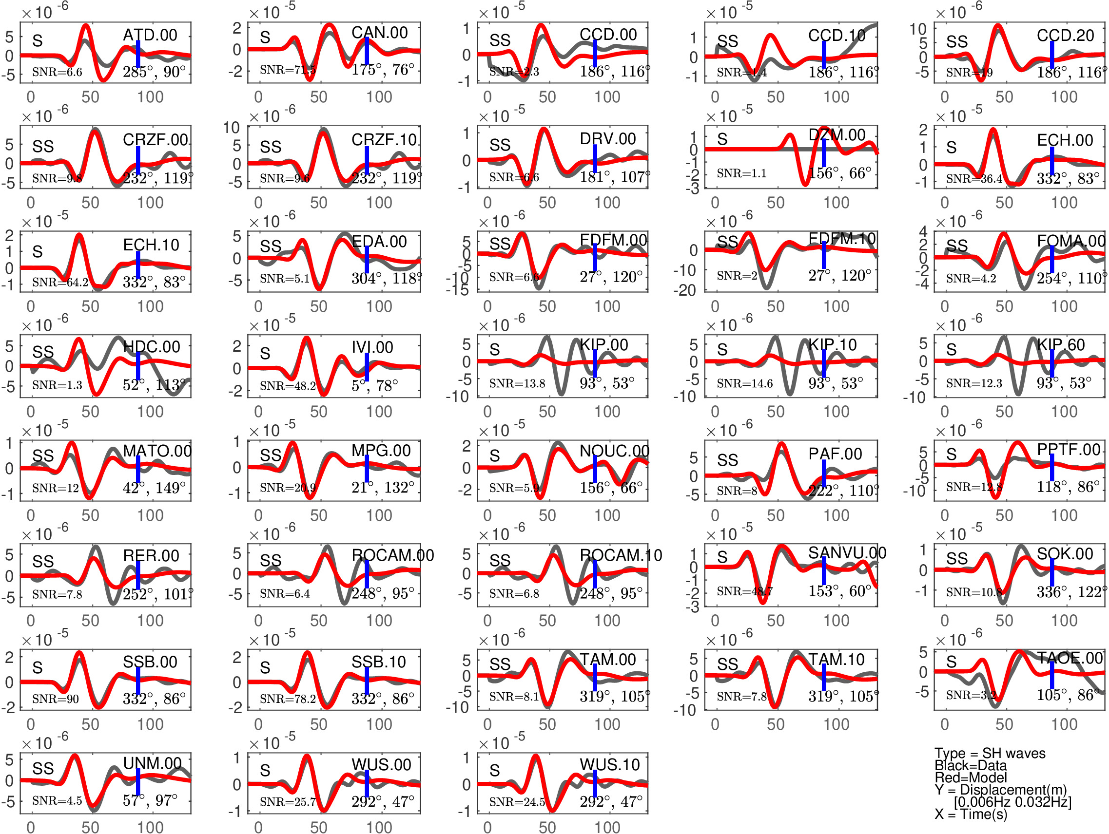 Figure 2: Same as Figure 1, but for S(H) or SS(H) waves (use of the rotated horizontal component along the transverse direction). See in Table 2 the quantitative estimates ('Dt1' and 'Fit1') corresponding to this Figure.