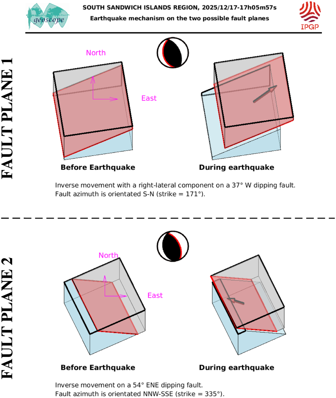 This figure illustrates how the two blocks separated by the seismic fault are displaced during the earthquake. These movements are deduced from the SCARDEC focal mechanism, on the two possible fault planes. Additional information (tectonics, near-fault measurements) is required to determine which one of these two hypotheses corresponds to the real movements during the earthquake.