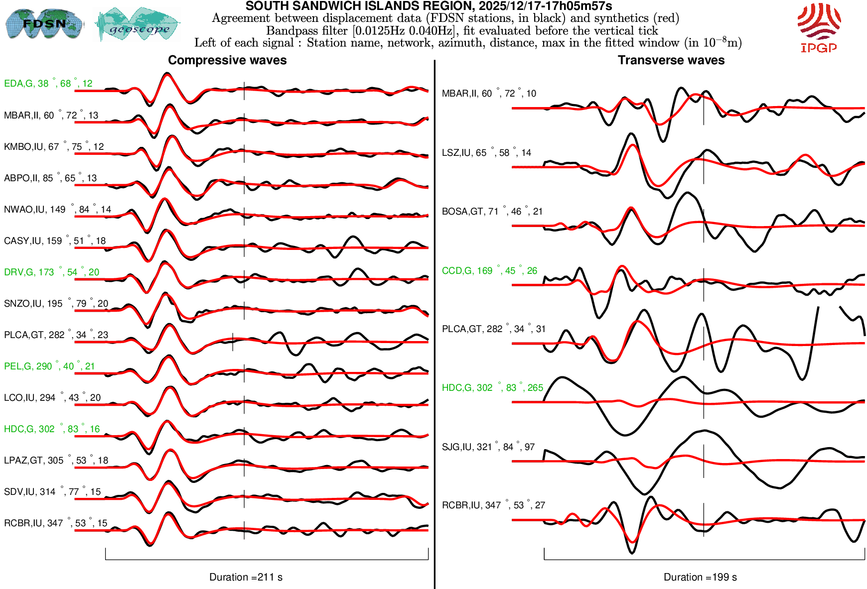 The SCARDEC solution is used here to predict the waveforms at all Geoscope stations received in real time and located at distances between 30° and 150° from the earthquake. All available location codes are used, for the BH* channels. In the range [30° - ~90°], the prediction is done on P and S(H) waves and in the range [~90° - 150°], it is done on PP and SS(H) waves. See agreement for P or PP waves (vertical components) between data and synthetics in Figure 1; see agreement for S(H) or SS(H) waves (horizontal components) between data (black) and synthetics (red) in Figure 2. Tables 1 and 2 provide quantitative estimates of these agreements.