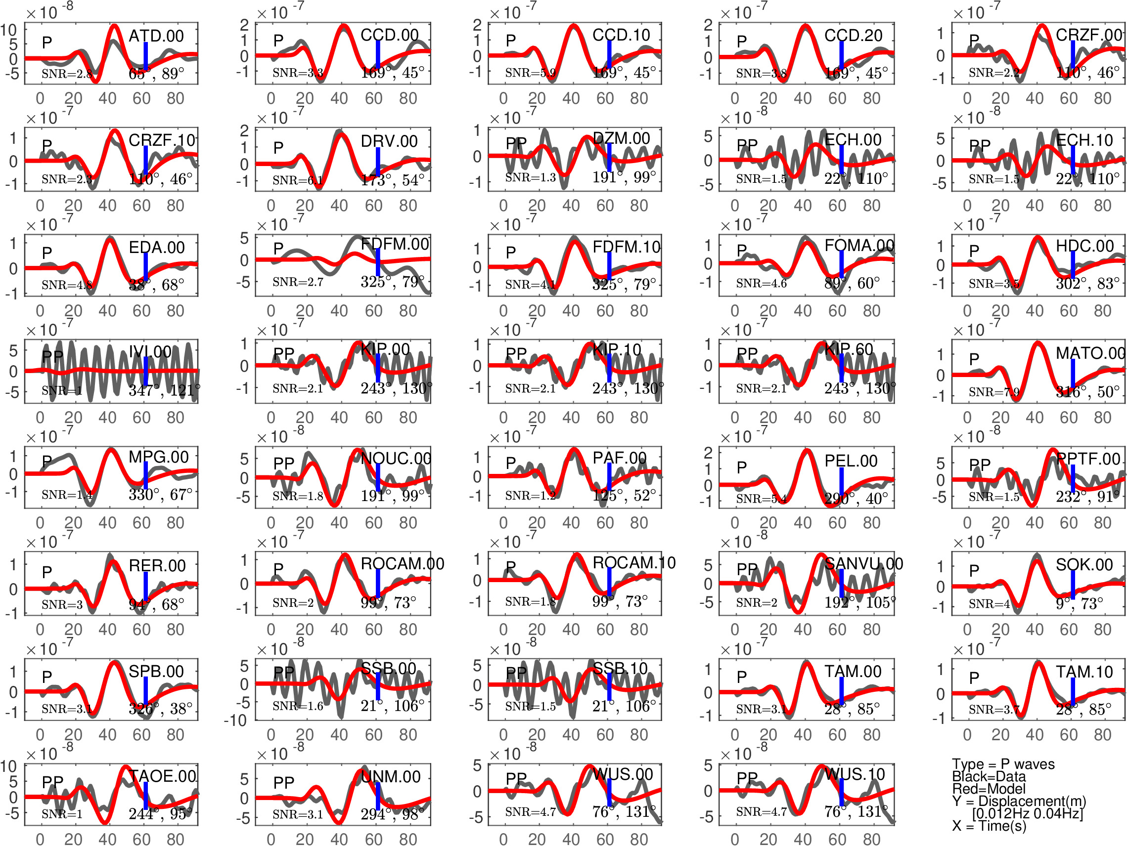 Figure 1: Agreement between data (black) and synthetics (red) for P or PP waves (the type of waves used is indicated in each subfigure). The comparison is shown with a time shift (noted 'Dt1' in Table 1), corresponding to the optimal fit ('Fit1' in Table 1) before the blue tick. Also indicated are the azimuth and distance of the station, and the signal to noise ratio (SNR). Note that the prediction done for PP waves is expected to be less accurate than the one for P waves.
