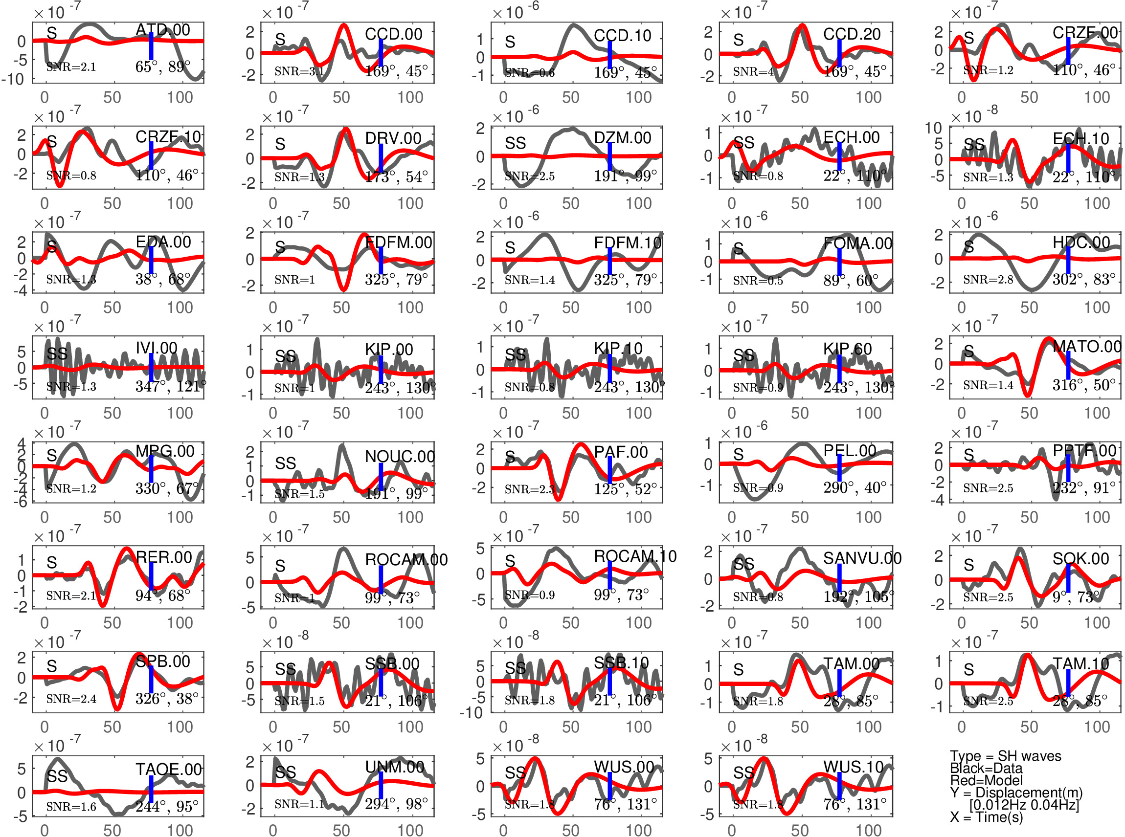Figure 2: Same as Figure 1, but for S(H) or SS(H) waves (use of the rotated horizontal component along the transverse direction). See in Table 2 the quantitative estimates ('Dt1' and 'Fit1') corresponding to this Figure.