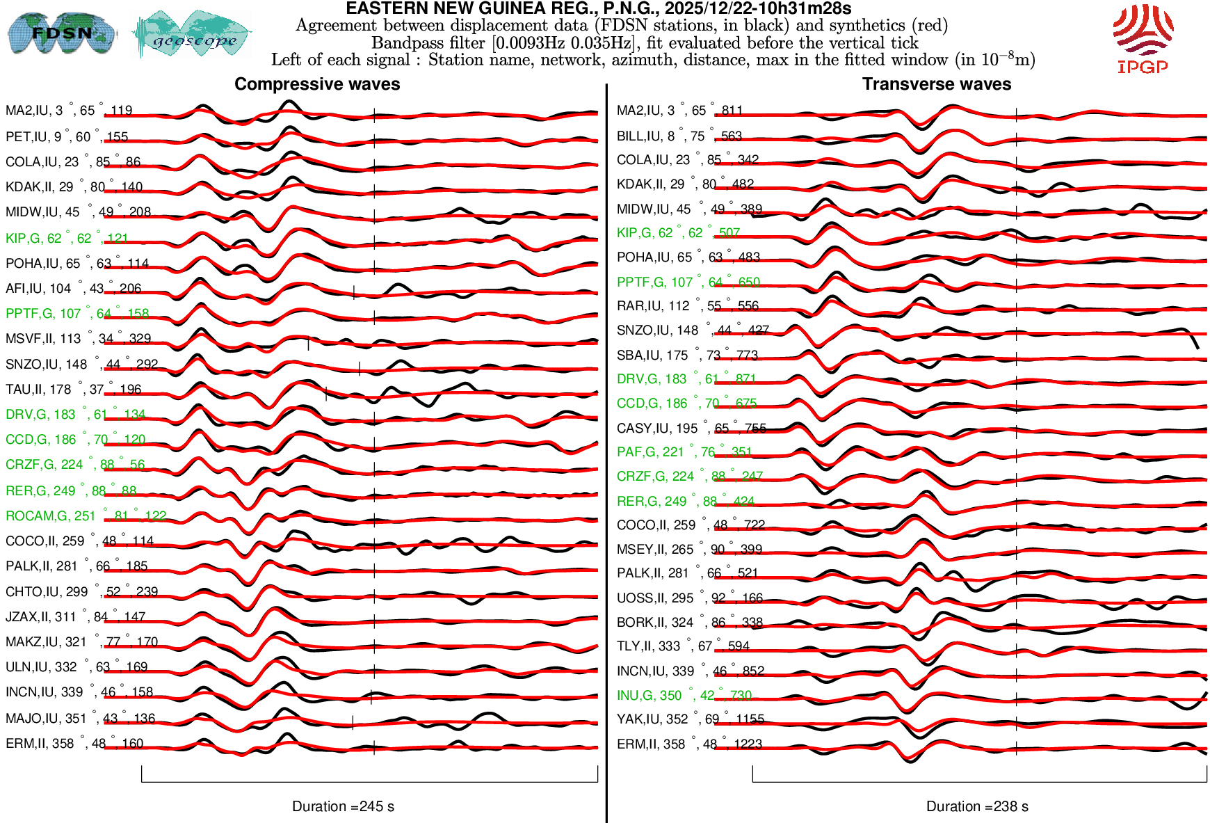 The SCARDEC solution is used here to predict the waveforms at all Geoscope stations received in real time and located at distances between 30° and 150° from the earthquake. All available location codes are used, for the BH* channels. In the range [30° - ~90°], the prediction is done on P and S(H) waves and in the range [~90° - 150°], it is done on PP and SS(H) waves. See agreement for P or PP waves (vertical components) between data and synthetics in Figure 1; see agreement for S(H) or SS(H) waves (horizontal components) between data (black) and synthetics (red) in Figure 2. Tables 1 and 2 provide quantitative estimates of these agreements.