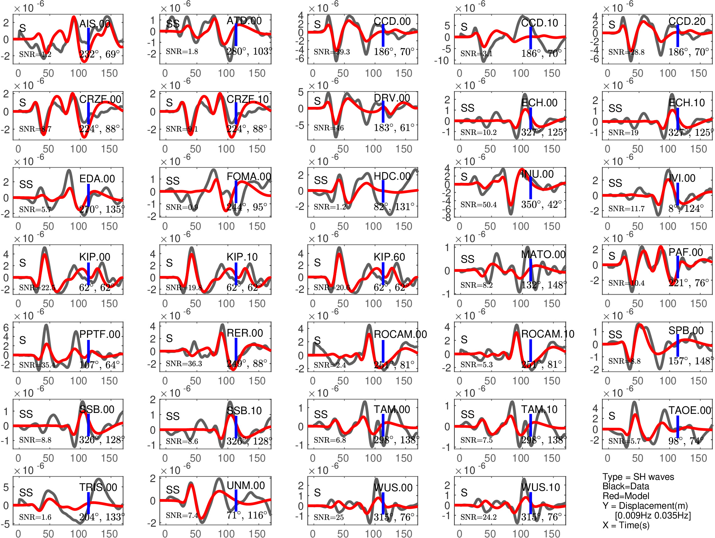 Figure 2: Same as Figure 1, but for S(H) or SS(H) waves (use of the rotated horizontal component along the transverse direction). See in Table 2 the quantitative estimates ('Dt1' and 'Fit1') corresponding to this Figure.