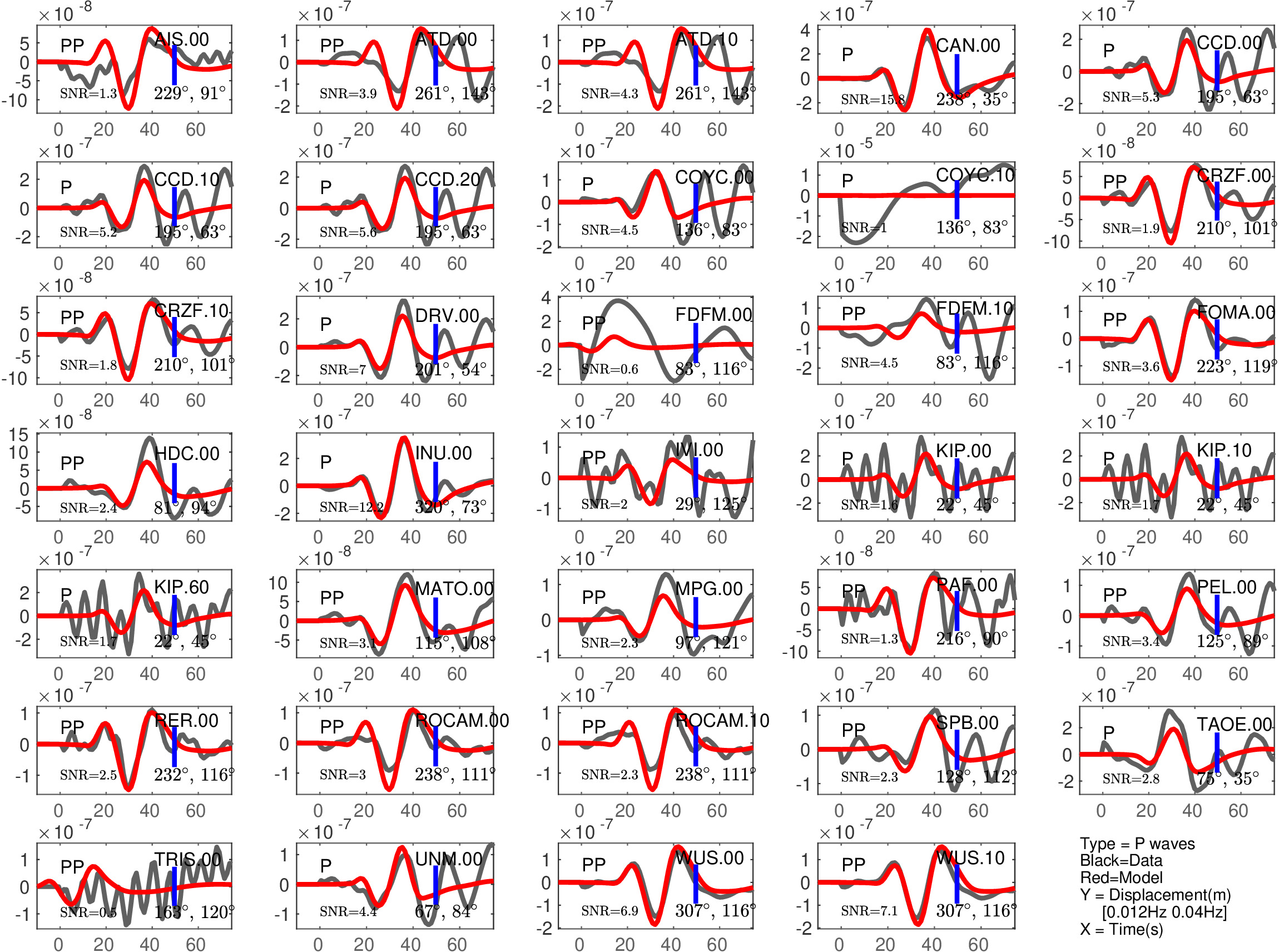 Figure 1: Agreement between data (black) and synthetics (red) for P or PP waves (the type of waves used is indicated in each subfigure). The comparison is shown with a time shift (noted 'Dt1' in Table 1), corresponding to the optimal fit ('Fit1' in Table 1) before the blue tick. Also indicated are the azimuth and distance of the station, and the signal to noise ratio (SNR). Note that the prediction done for PP waves is expected to be less accurate than the one for P waves.