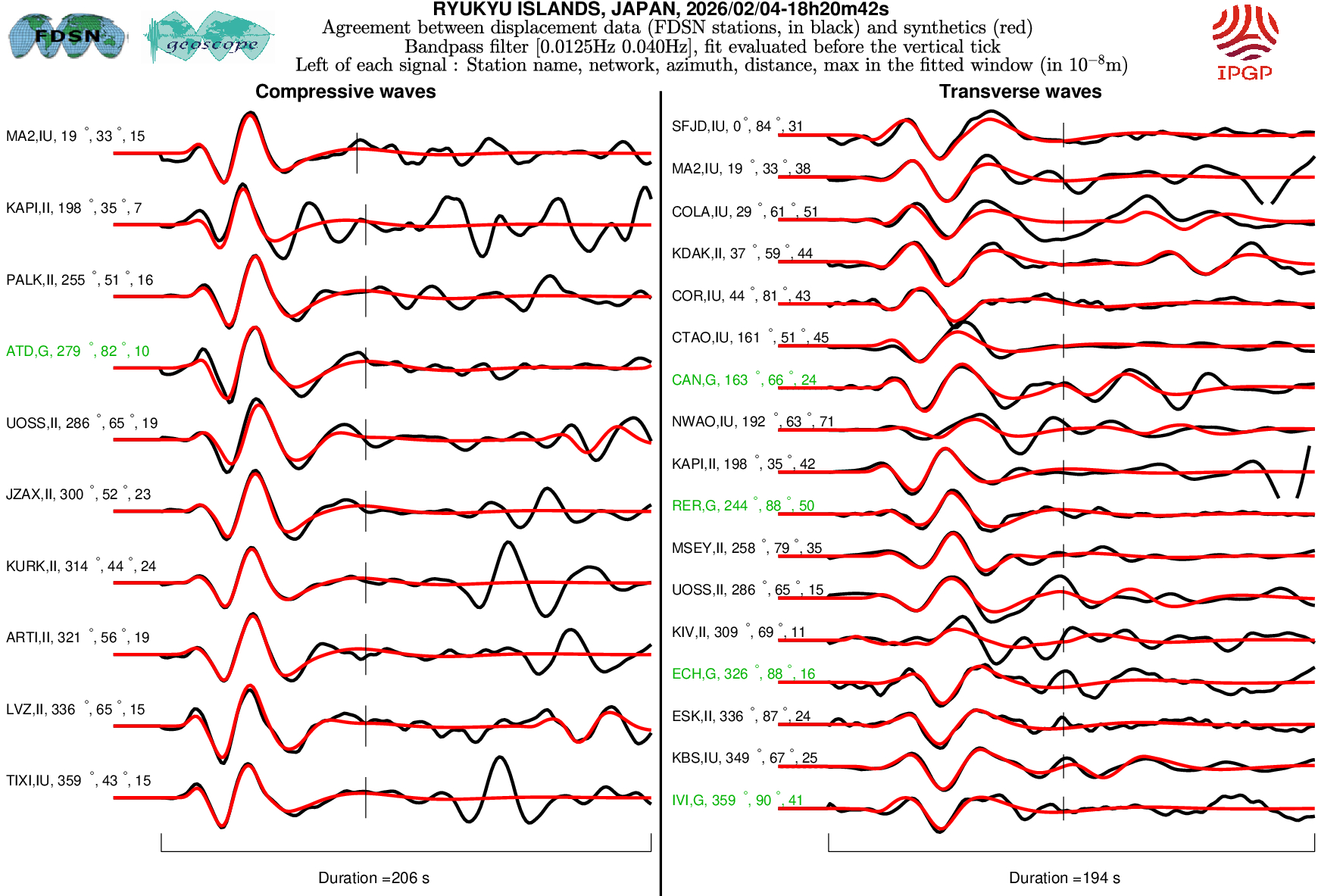 The SCARDEC solution is used here to predict the waveforms at all Geoscope stations received in real time and located at distances between 30° and 150° from the earthquake. All available location codes are used, for the BH* channels. In the range [30° - ~90°], the prediction is done on P and S(H) waves and in the range [~90° - 150°], it is done on PP and SS(H) waves. See agreement for P or PP waves (vertical components) between data and synthetics in Figure 1; see agreement for S(H) or SS(H) waves (horizontal components) between data (black) and synthetics (red) in Figure 2. Tables 1 and 2 provide quantitative estimates of these agreements.