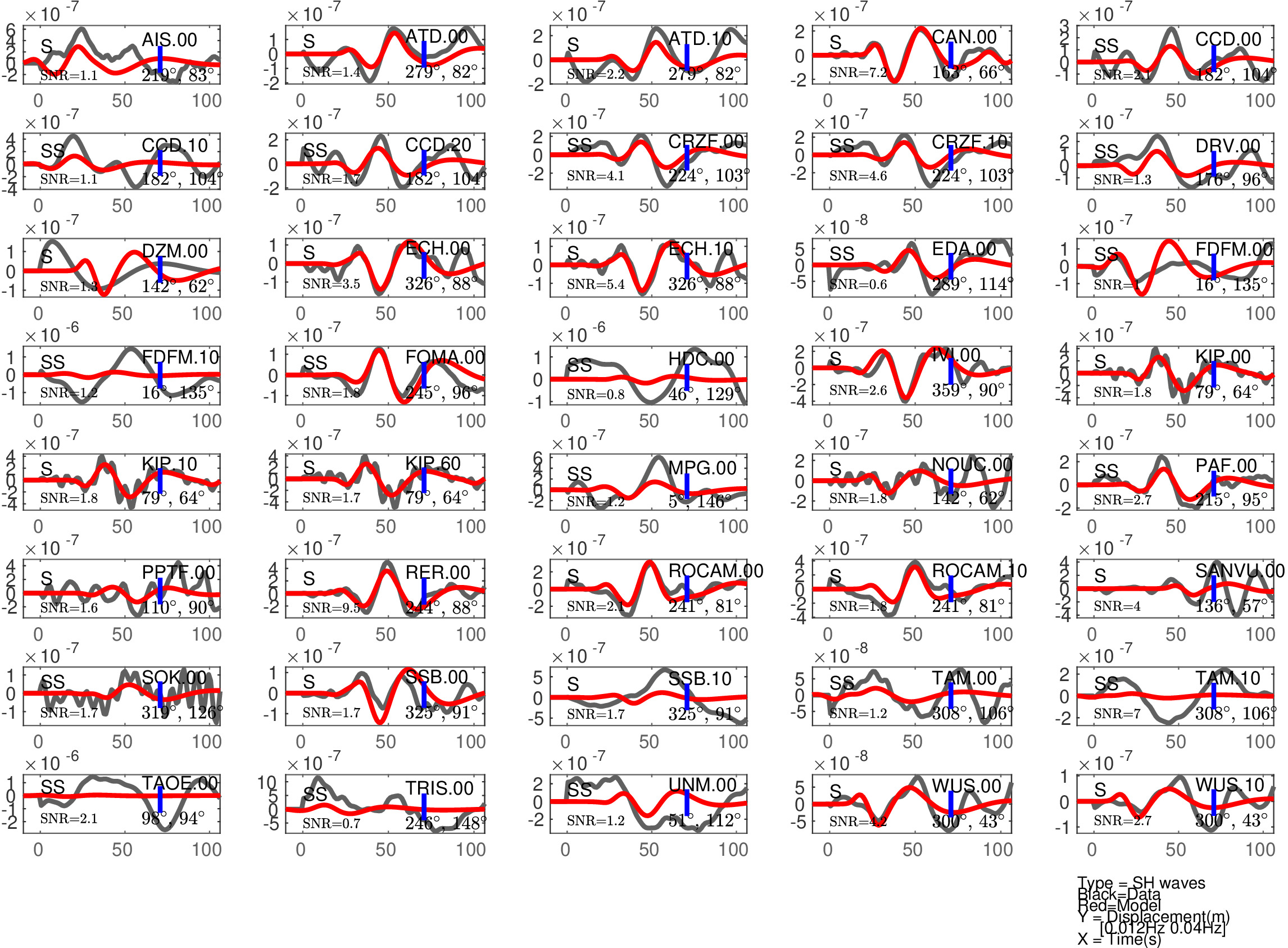 Figure 2: Same as Figure 1, but for S(H) or SS(H) waves (use of the rotated horizontal component along the transverse direction). See in Table 2 the quantitative estimates ('Dt1' and 'Fit1') corresponding to this Figure.