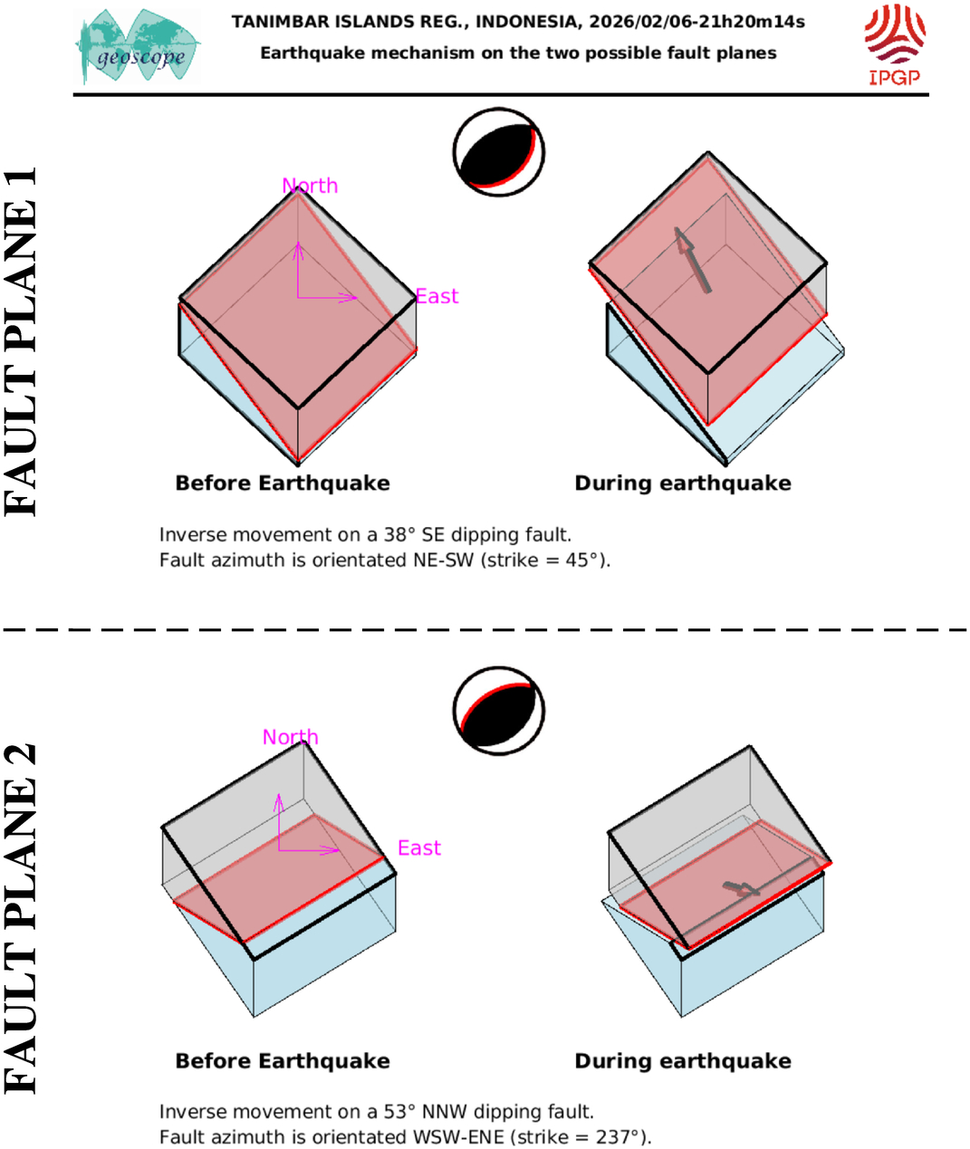 This figure illustrates how the two blocks separated by the seismic fault are displaced during the earthquake. These movements are deduced from the SCARDEC focal mechanism, on the two possible fault planes. Additional information (tectonics, near-fault measurements) is required to determine which one of these two hypotheses corresponds to the real movements during the earthquake.