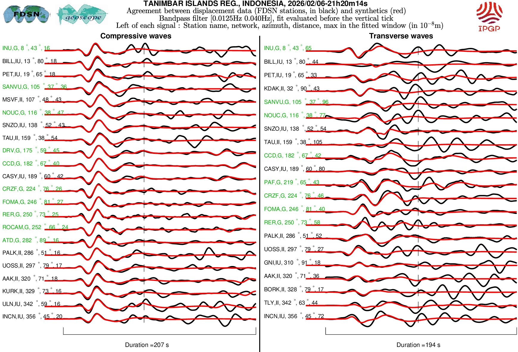 The SCARDEC solution is used here to predict the waveforms at all Geoscope stations received in real time and located at distances between 30° and 150° from the earthquake. All available location codes are used, for the BH* channels. In the range [30° - ~90°], the prediction is done on P and S(H) waves and in the range [~90° - 150°], it is done on PP and SS(H) waves. See agreement for P or PP waves (vertical components) between data and synthetics in Figure 1; see agreement for S(H) or SS(H) waves (horizontal components) between data (black) and synthetics (red) in Figure 2. Tables 1 and 2 provide quantitative estimates of these agreements.
