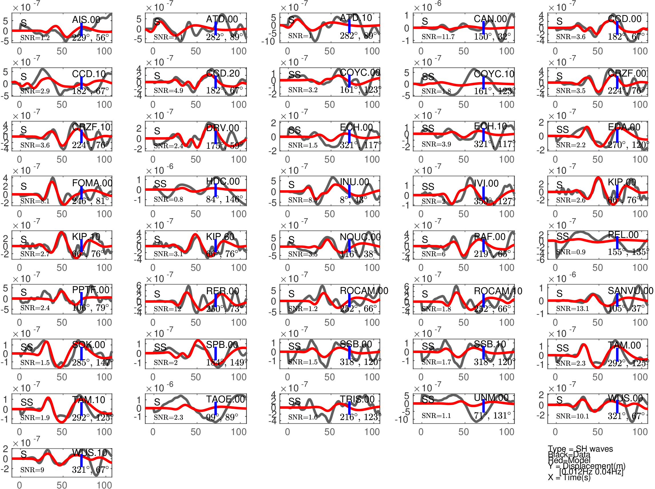 Figure 2: Same as Figure 1, but for S(H) or SS(H) waves (use of the rotated horizontal component along the transverse direction). See in Table 2 the quantitative estimates ('Dt1' and 'Fit1') corresponding to this Figure.