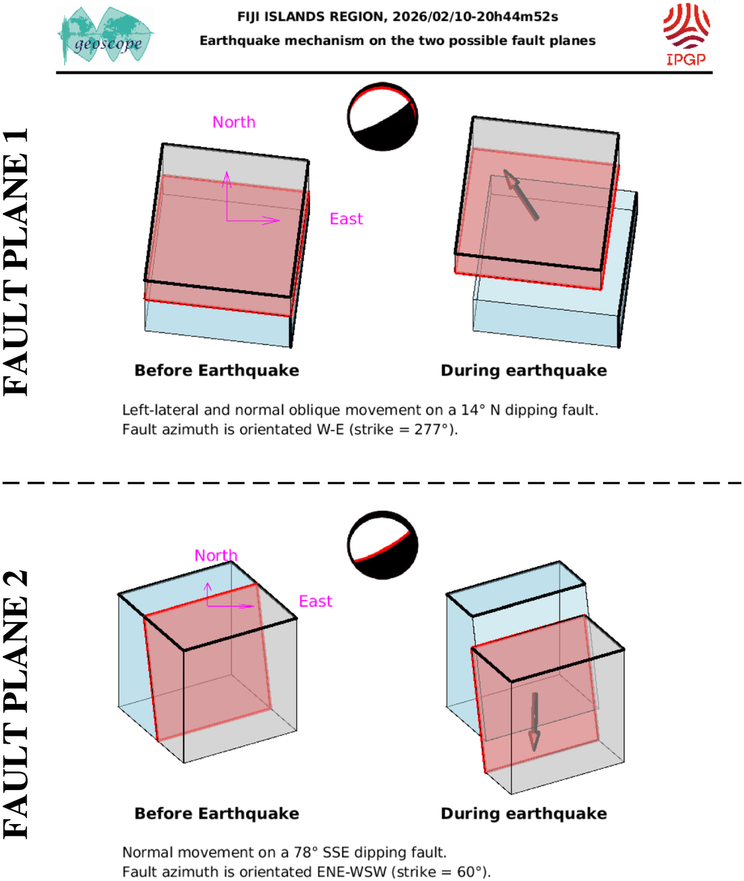 This figure illustrates how the two blocks separated by the seismic fault are displaced during the earthquake. These movements are deduced from the SCARDEC focal mechanism, on the two possible fault planes. Additional information (tectonics, near-fault measurements) is required to determine which one of these two hypotheses corresponds to the real movements during the earthquake.