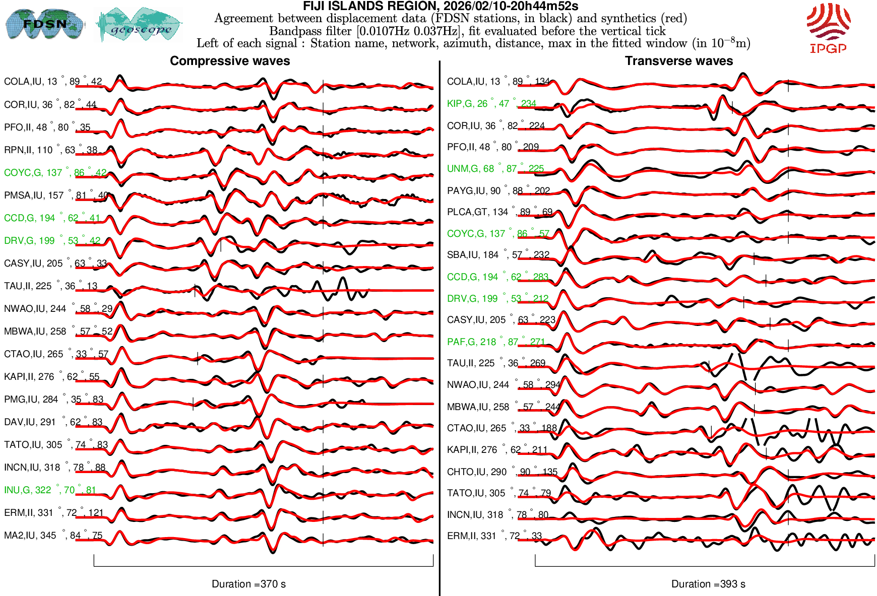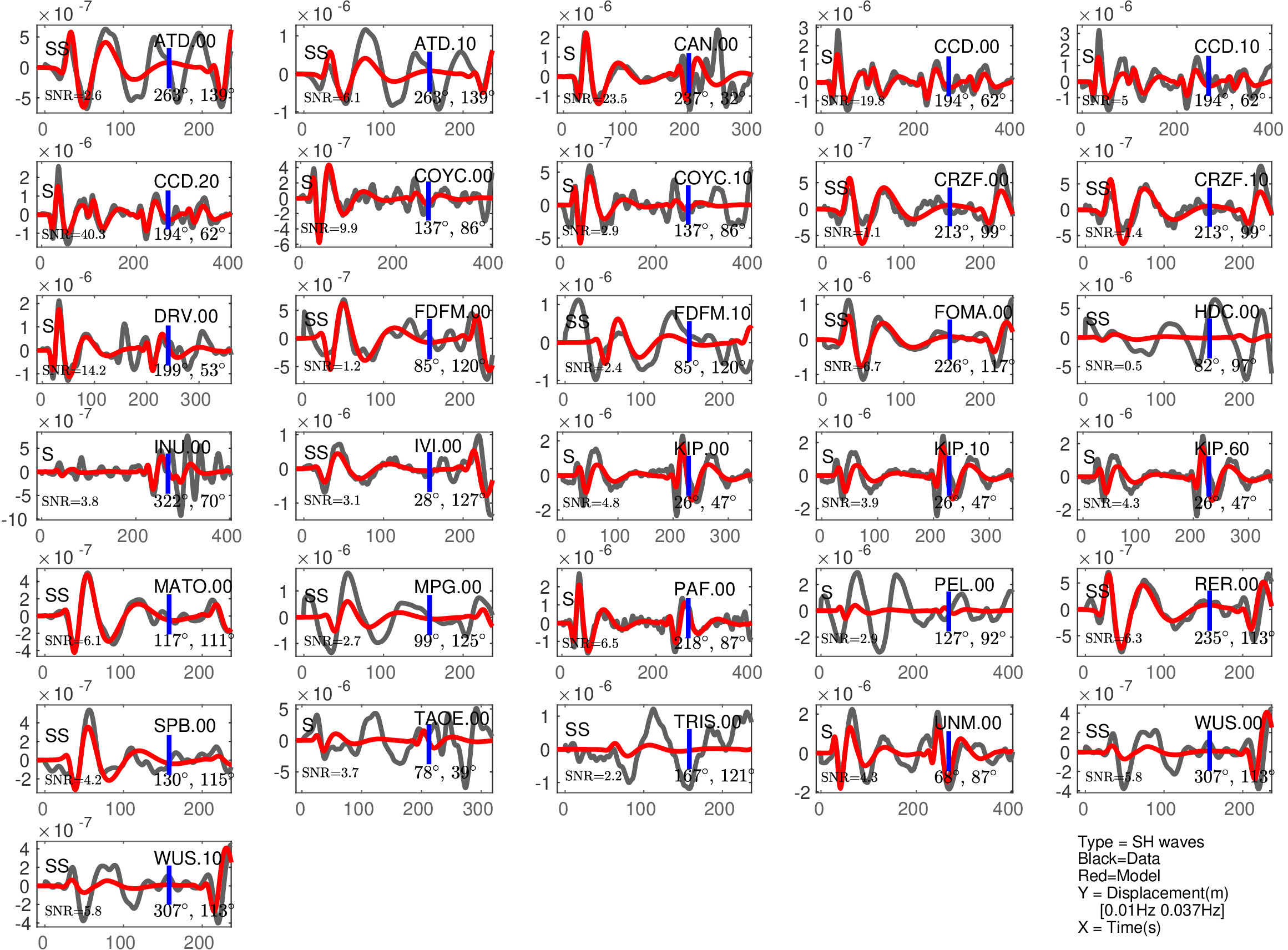 The SCARDEC solution is used here to predict the waveforms at all Geoscope stations received in real time and located at distances between 30° and 150° from the earthquake. All available location codes are used, for the BH* channels. In the range [30° - ~90°], the prediction is done on P and S(H) waves and in the range [~90° - 150°], it is done on PP and SS(H) waves. See agreement for P or PP waves (vertical components) between data and synthetics in Figure 1; see agreement for S(H) or SS(H) waves (horizontal components) between data (black) and synthetics (red) in Figure 2. Tables 1 and 2 provide quantitative estimates of these agreements.