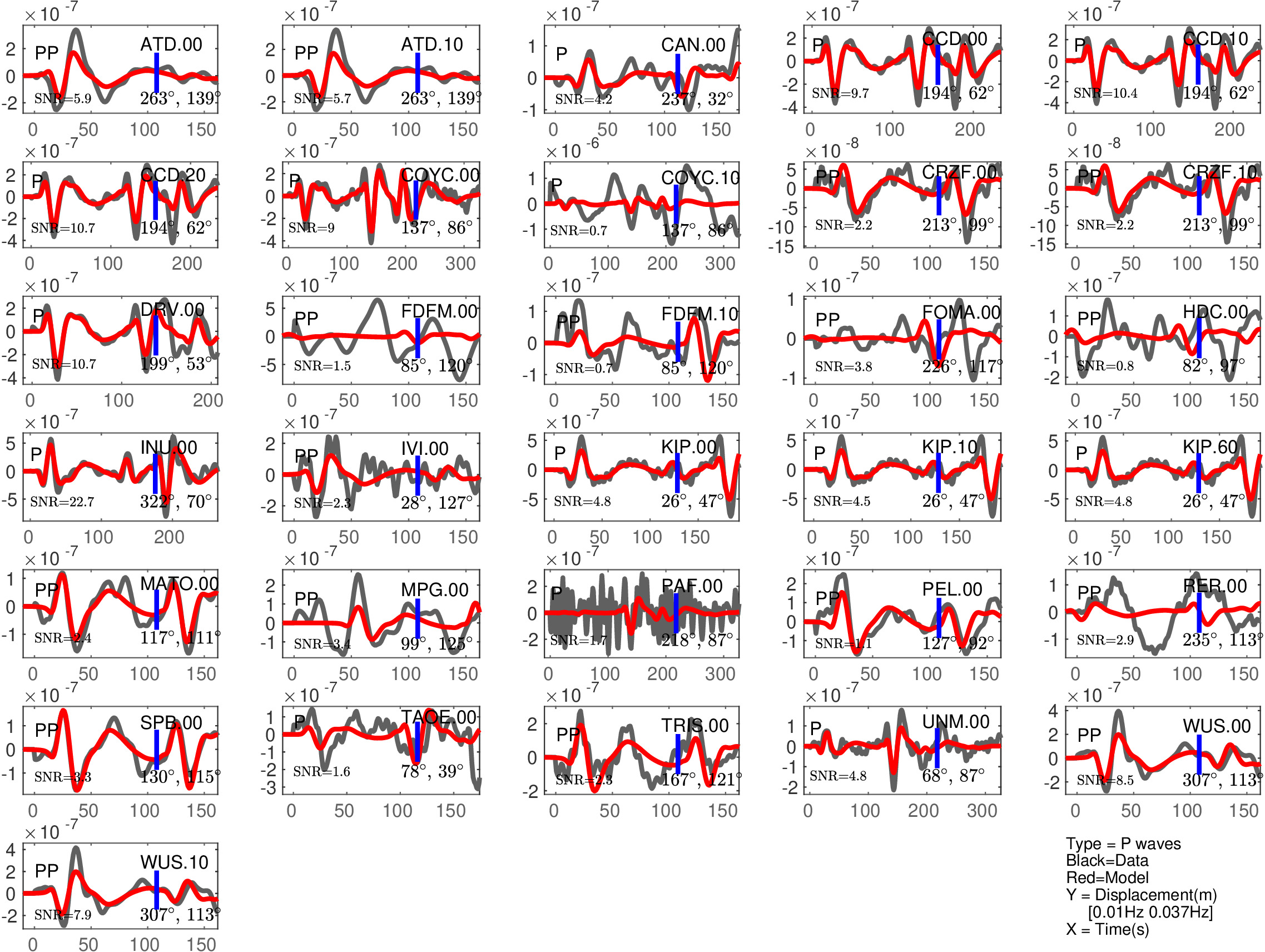 Figure 1: Agreement between data (black) and synthetics (red) for P or PP waves (the type of waves used is indicated in each subfigure). The comparison is shown with a time shift (noted 'Dt1' in Table 1), corresponding to the optimal fit ('Fit1' in Table 1) before the blue tick. Also indicated are the azimuth and distance of the station, and the signal to noise ratio (SNR). Note that the prediction done for PP waves is expected to be less accurate than the one for P waves.
